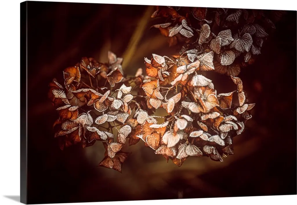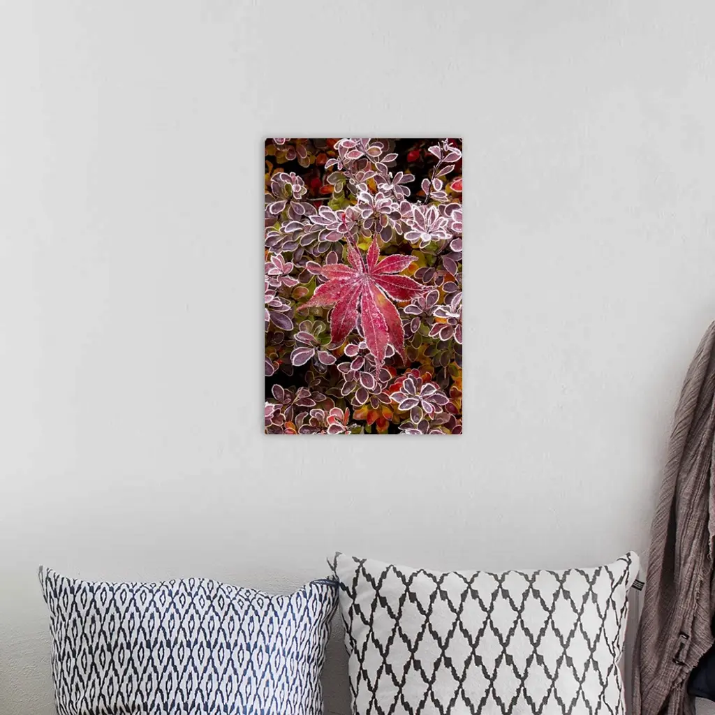 USA, Washington State, Sammamish. Autumn colors on frosted barberry and fallen Japanese maple Leaf.