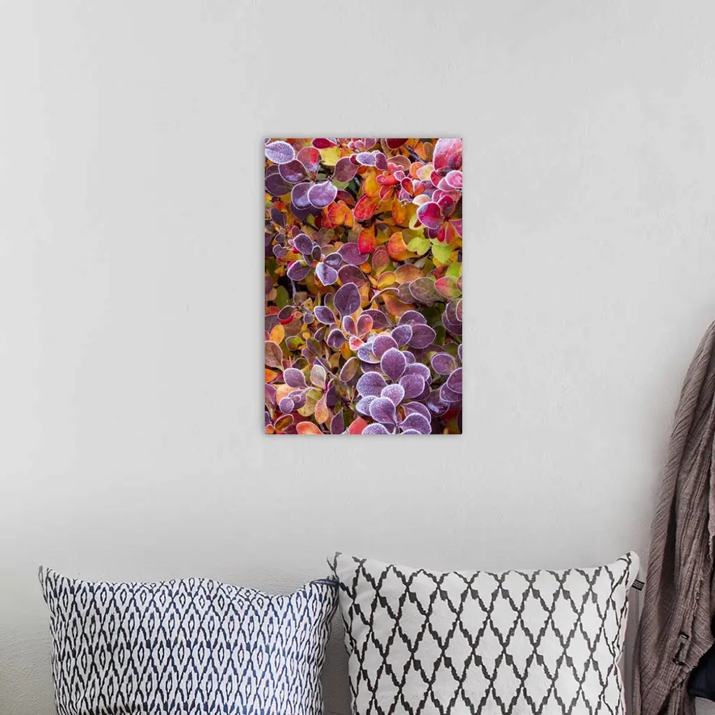 USA, Washington State, Sammamish. Close-up of frosted barberry leaves in Autumn.
