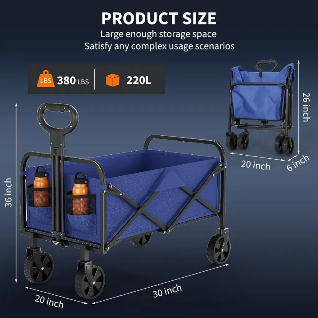 【Heavy Duty and Sturdy Construction】 Built with an alloy frame and tough 600D Oxford fabric, this utility wagon supports up to 110 lbs. The fabric is tear-resistant, waterproof and can be easily removed for cleaning. 220L large capacity design ensures that you can carry everything you need, it's your go-to for grocery wagon runs or camping wagon adventures. 【Adjustable Handle and All-Terrain 360° Wheels】 Designed for smooth maneuvering, the 90-degree adjustable handle can be raised or lowered to suit your preferred holding style. This collapsible wagon meets the needs of users of different heights. The 360° all-terrain wheels easily navigate sand, gravel, grass, and uneven paths, allowing you to pull or push effortlessly across a variety of outdoor landscapes. 【Lightweight Design for Portability】Weighing only 12 pounds, this wagon is lighter than traditional carts yet offers enhanced stability. It's so easy to handle that even women can lift it effortlessly with one hand. It folds down in seconds to a compact 20 x 6 x 26 inch size, making it convenient to store in your car trunk or small storage space. 【Thoughtful Features for Enhanced User Experience】 To make your outdoor journeys more convenient, this utility camping wagon includes 2 built-in cup holders, smartphones, or small accessories. The combination of lightweight design, strong materials, flexible handle, and all-terrain wheels makes it a versatile and reliable solution for all your hauling needs. 【Solve Your Confusion】 We are committed to providing high-quality service and reliable quality. Please feel free to contact us if there is any question about the wagons carts. We'll get back to you within 24 hours.