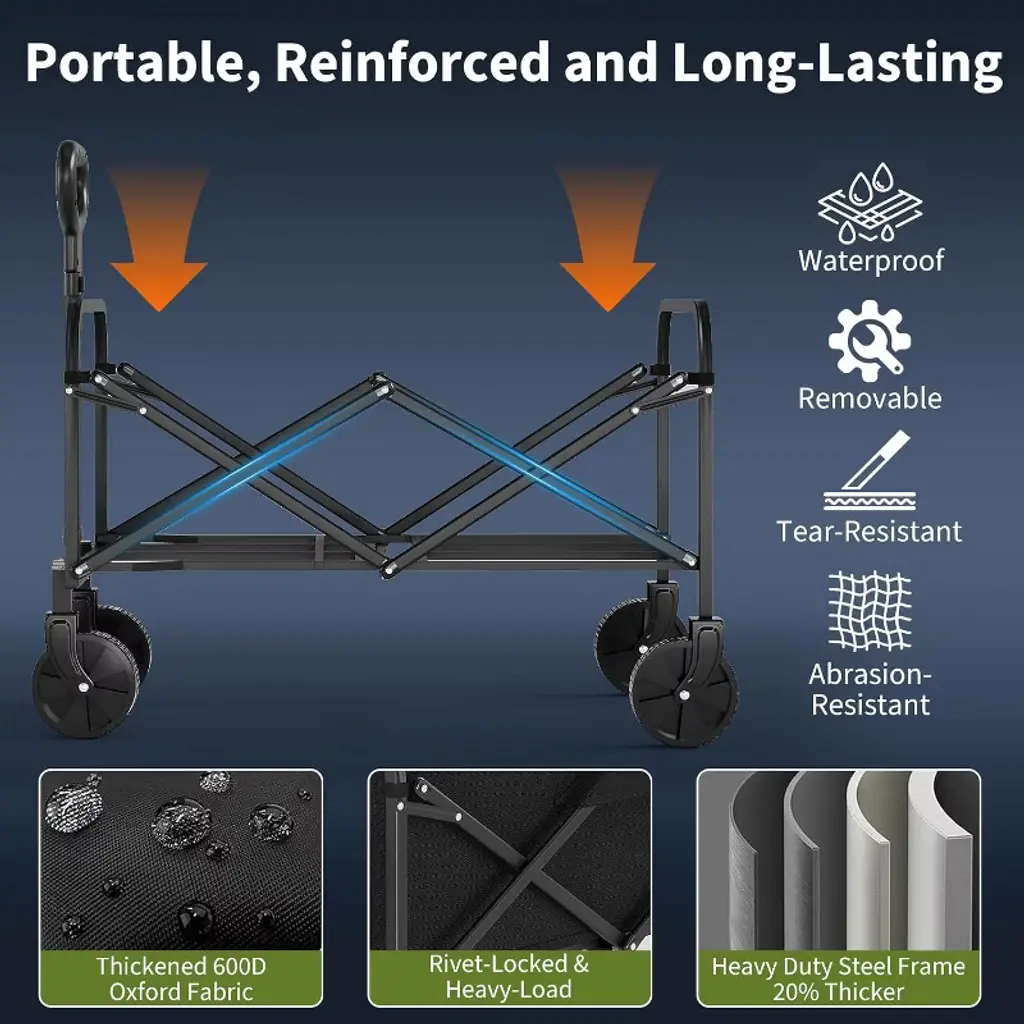 【Heavy Duty and Sturdy Construction】 Built with an alloy frame and tough 600D Oxford fabric, this utility wagon supports up to 380 lbs. The fabric is tear-resistant, waterproof and can be easily removed for cleaning. 220L large capacity design ensures that you can carry everything you need, it's your go-to for grocery wagon runs or camping wagon adventures. 【Adjustable Handle and All-Terrain 360° Wheels】 Designed for smooth maneuvering, the 90-degree adjustable handle can be raised or lowered to suit your preferred holding style. This collapsible wagon meets the needs of users of different heights. The 360° all-terrain wheels easily navigate sand, gravel, grass, and uneven paths, allowing you to pull or push effortlessly across a variety of outdoor landscapes. 【Lightweight Design for Portability】Weighing only 12 pounds, this wagon is lighter than traditional carts yet offers enhanced stability. It's so easy to handle that even women can lift it effortlessly with one hand. It folds down in seconds to a compact 20 x 6 x 26 inch size, making it convenient to store in your car trunk or small storage space. 【Thoughtful Features for Enhanced User Experience】 To make your outdoor journeys more convenient, this utility camping wagon includes 2 built-in cup holders, smartphones, or small accessories. The combination of lightweight design, strong materials, flexible handle, and all-terrain wheels makes it a versatile and reliable solution for all your hauling needs. 【Solve Your Confusion】 We are committed to providing high-quality service and reliable quality. Please feel free to contact us if there is any question about the wagons carts. We'll get back to you within 24 hours.