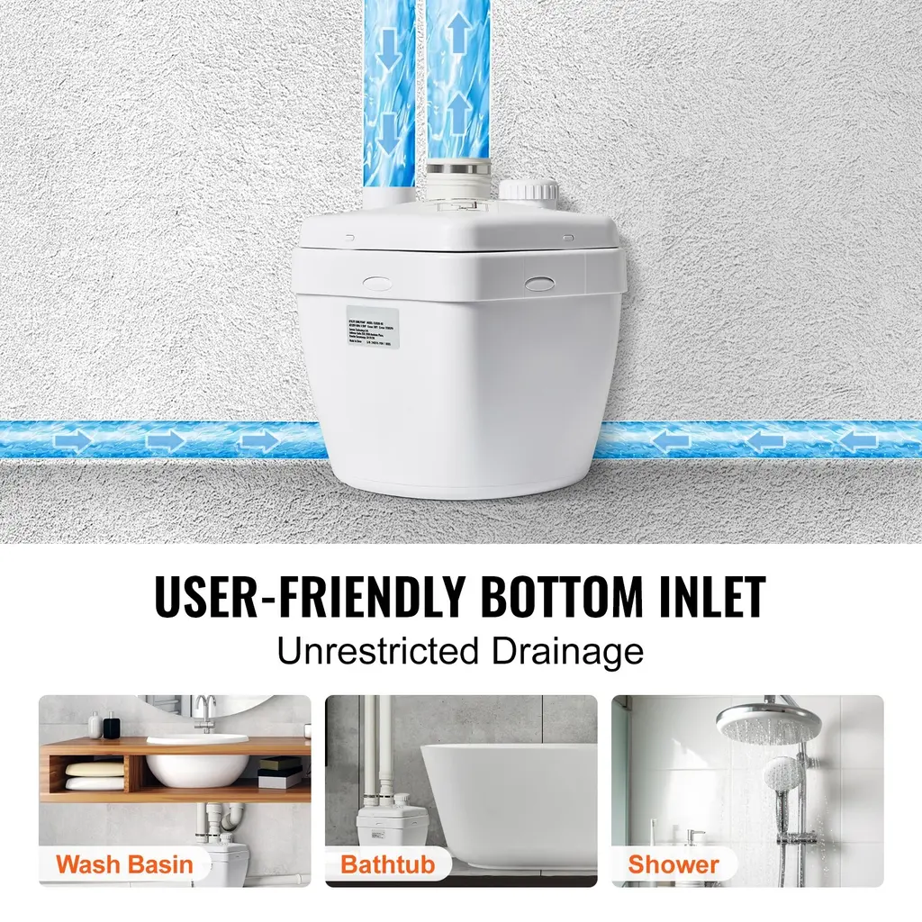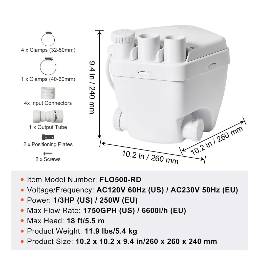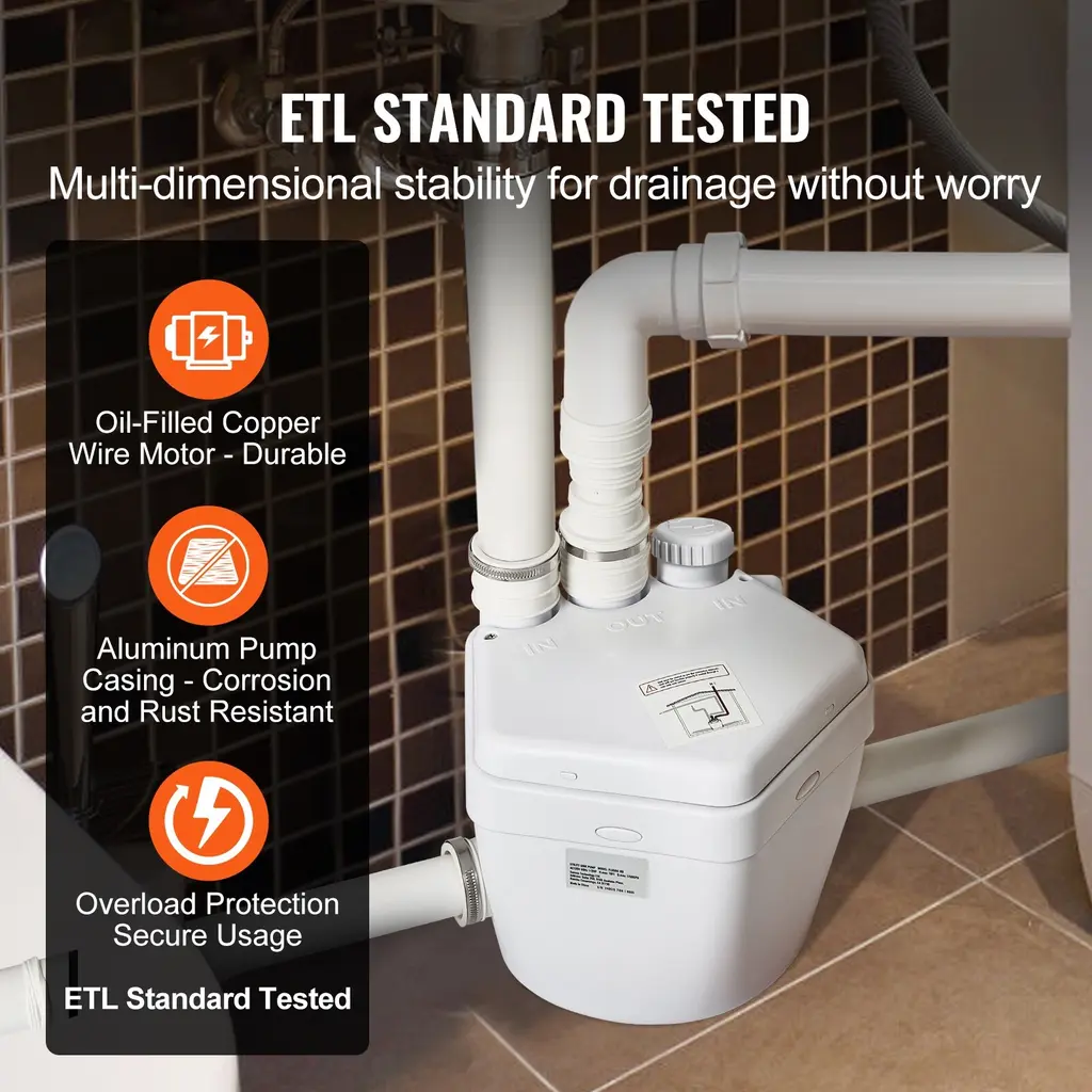 Durable and Reliable: Our utility sink pump is built to last, meeting ETL standards with an oil-filled copper-wire motor to prevent overheating. Crafted from corrosion-resistant cast aluminum, it ensures stable, long-lasting performance, keeping your basement dry without fail. Rapid Drainage: This powerful drain pump, boasting 1/2 HP input power and 1/3 HP output power, spins at a whopping 3500 RPM, delivering a maximum flow rate of 1500 GPH. With a max head of 18 ft and a wide 1-1/2" outlet, it ensures swift water removal for all your needs. Low Drainage Outlet: Say goodbye to standing water in your shower or bathtub! Our sink pump comes with a low discharge outlet at the bottom, making it super easy for sewage to flow out smoothly. No more clogs or slow drainage - just efficient waste disposal! Oil-Filled Motor: Enjoy peace and quiet with our sump pump's oil-filled copper-wire motor. Its advanced design reduces vibration, minimizing noise for a more serene environment. Now you can drain water quickly and quietly, without disturbing your peace or your neighbors! Easy Installation: Installing our under-sink sump pump is a breeze! Just attach the pump, vertical switch, and discharge pipe to your drainage bucket, and you're good to go. No need for complicated setups or lengthy instructions - get it done in no time and start enjoying a dry, hassle-free basement today! Package Content 1 x Utility Sink Pump 4 x Clamps 2 x Positioning Plates 1 x Output Tube 3 x Input Connectors 2 x Screws