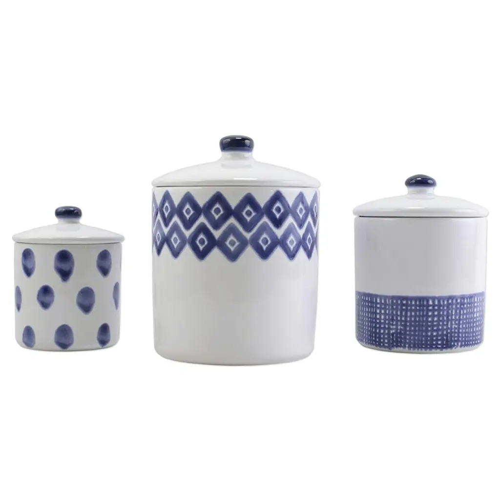 This Set Of Two, Sapphire Blue Ceramic Containers Feature A Geometric Pattern With Ivory Undertones And Lift-off Lids. Sizes: S-5x8x5, L-7x8x7 Containers, S/2 from the Saniya collection in Blue finishThis Set Of Two, Sapphire Blue Ceramic Containers Feature A Geometric Pattern With Ivory Undertones And Lift-off Lids. Sizes: S-5x8x5, L-7x8x7Width: 7.00"Height: 8.25"Length: 7.00"Weight: 4.00 lb