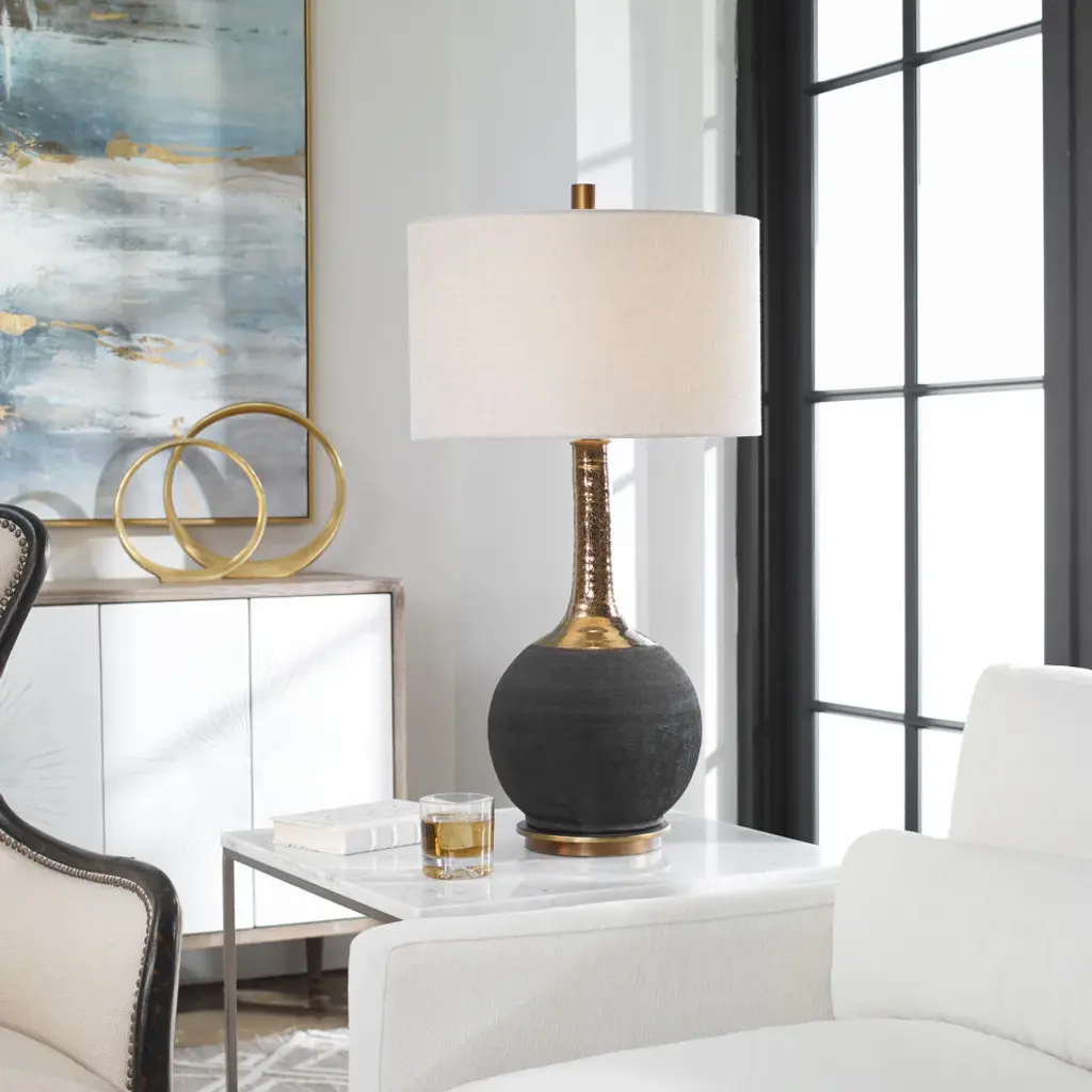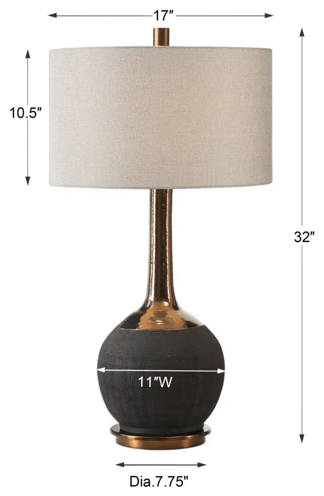 This Ceramic Base Features A Textured, Matte Black Hand-scored Body, Accented With A Metallic Gold Glazed Neck. The Round Hardback Drum Shade Is A Light Gray Linen Fabric.Voltage : 110Wattage : 150W