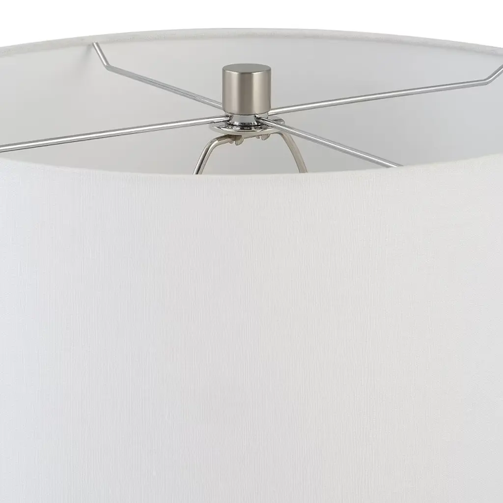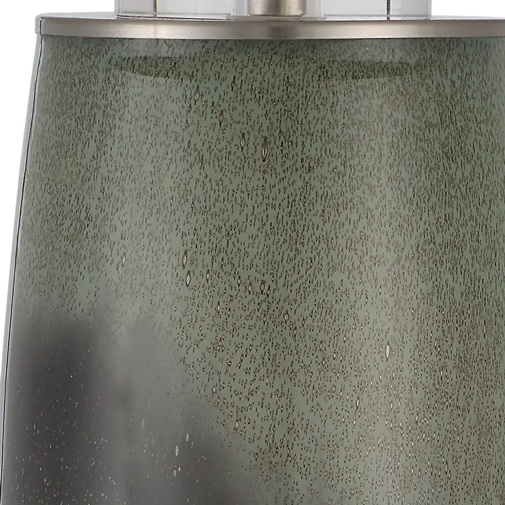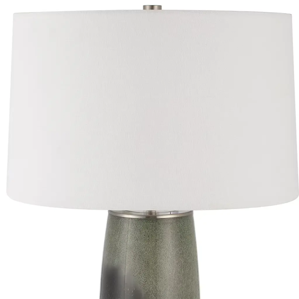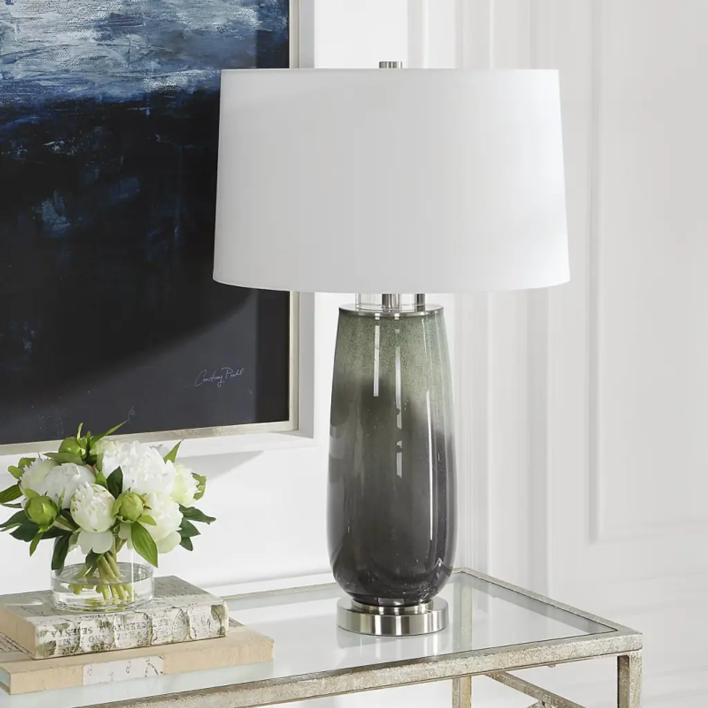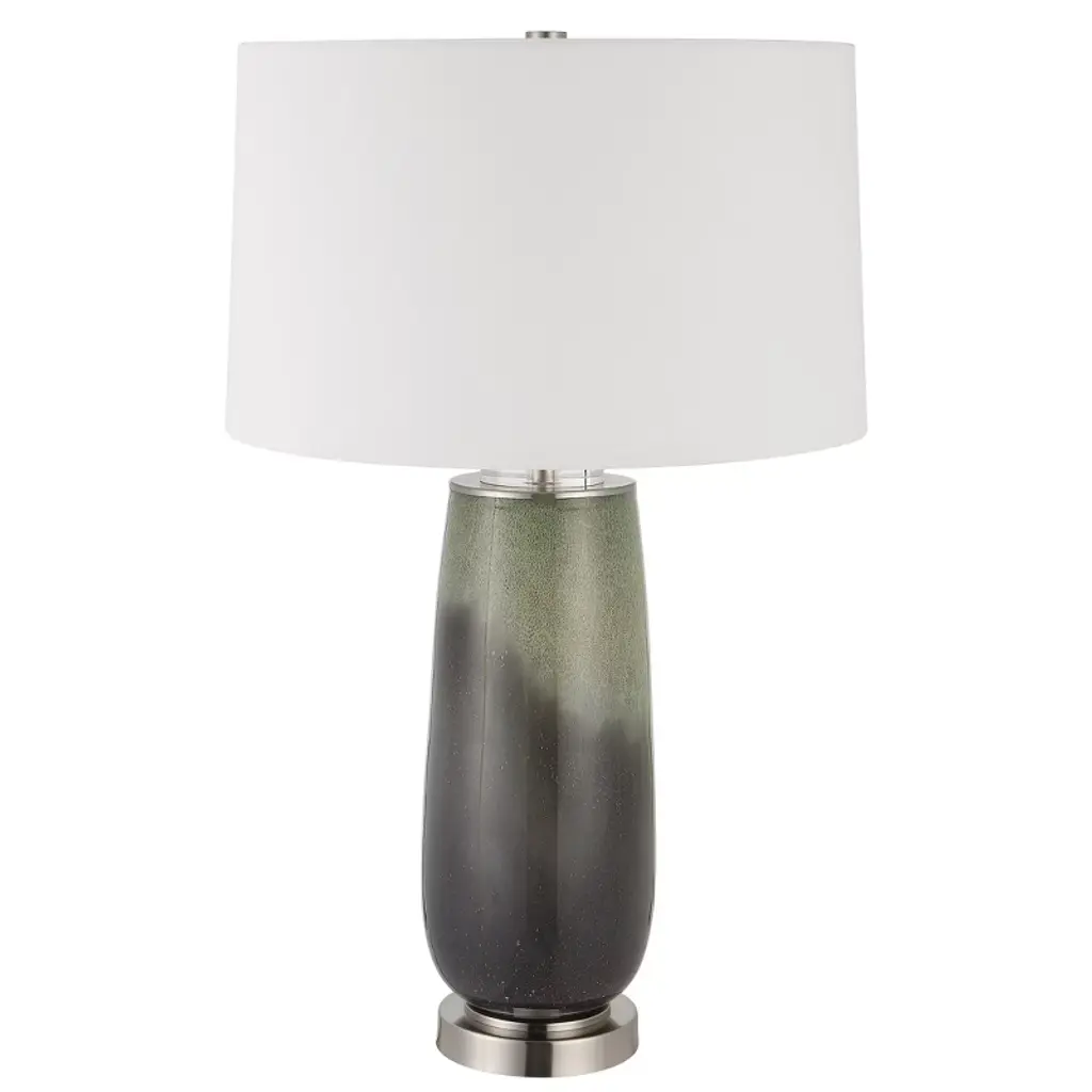 Bring elegance and color to any room with the Uttermost Campa Gray-Blue Table Lamp. The lamp features a speckled green and gray-blue ombre glass base, accented with crystal details and brushed nickel-finished iron components for a refined, contemporary look. Its round hardback shade, slightly tapered and covered in white cotton fabric, softly diffuses light, creating a warm and inviting ambiance. Measuring 28"H × 17"W × 17"D, this lamp is ideal for desks, nightstands, or living room tabletops, perfectly complementing modern, transitional, and eclectic interiors. Product Features: Material: Glass base with crystal accents, brushed nickel iron, cotton fabric shadeColor: Green and gray-blue ombre glass, brushed nickel, white shadeFinish/Frame: Brushed nickel iron accents with crystal detailsDimensions: 28"H × 17"W × 17"DShade: Round hardback, 10"H, top 16"W × 16"D, bottom 17"W × 17"DBulb: 150W, 1 TYPE A, 3-way socketStyle Match: Contemporary, transitional, eclectic interiors