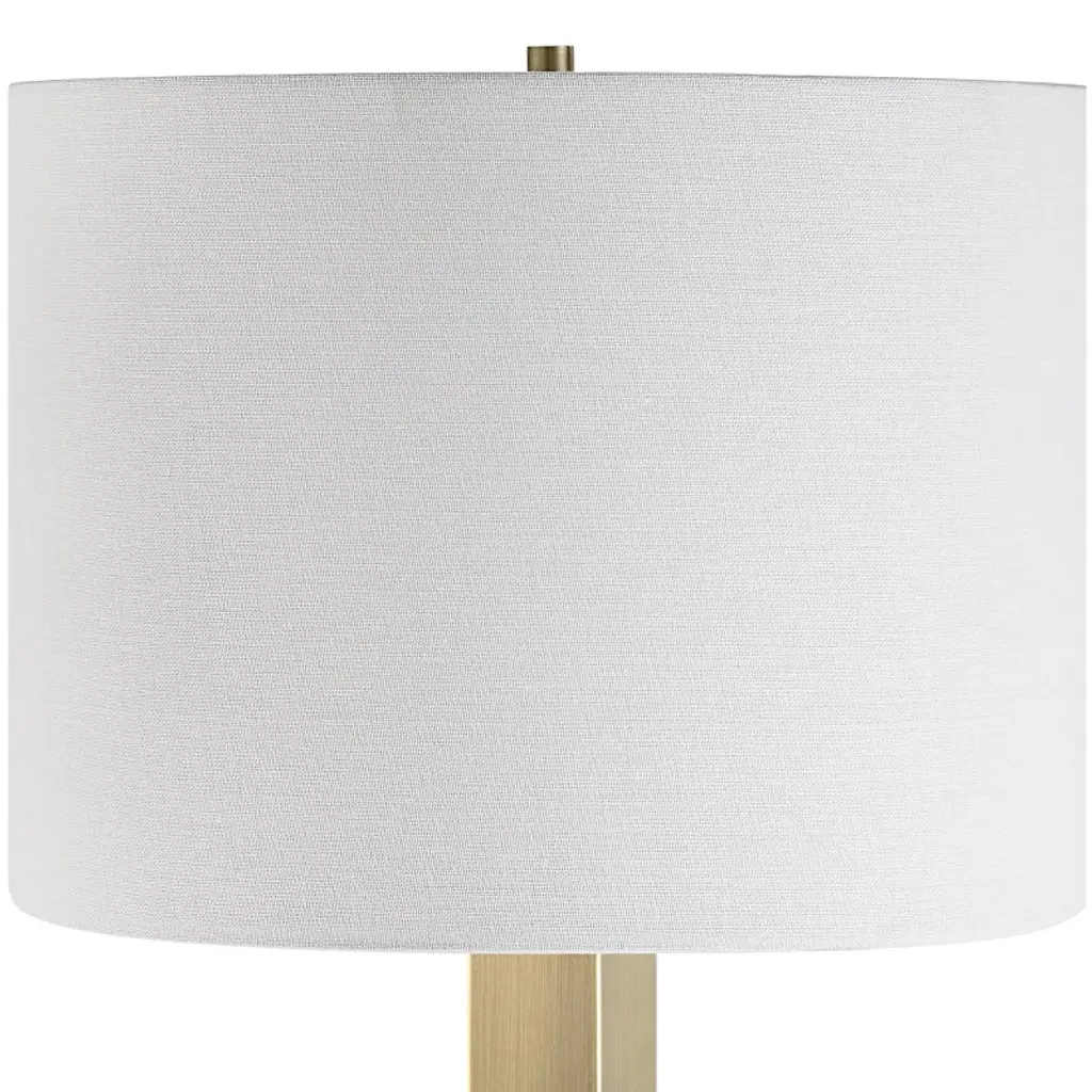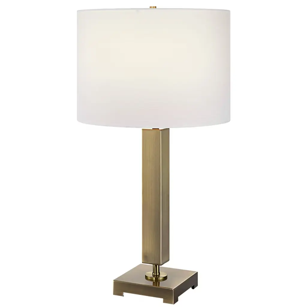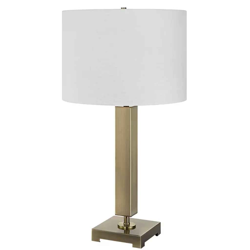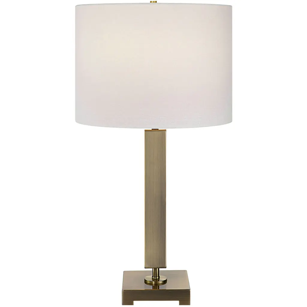Elevate your decor with the refined elegance of the Uttermost Duomo Brass Table Lamp. Featuring a sleek metal column base in a radiant antique brass finish, this lamp brings understated luxury and warm metallic charm to modern or transitional interiors. Measuring 14"D × 14"W × 27"H and weighing 5.06 lbs, it is topped with a round hardback shade wrapped in white linen fabric for a crisp, clean contrast. Designed for a single 150W Type A bulb with a 3-way socket, this versatile piece works beautifully on nightstands, side tables, or entry consoles. Key Benefits Timeless Simplicity: Clean lines and a warm antique brass finish make this lamp a perfect fit for both modern and transitional interiors — 14"D × 14"W × 27"H Soft Ambient Glow: Crisp white linen shade diffuses light beautifully, creating cozy ambiance Space-Saving Design: Slim metal column base offers style without bulk Customizable Lighting: 3-way socket provides adjustable brightness for reading or relaxation Premium Craftsmanship: Built with high-quality materials and reinforced packaging for durability