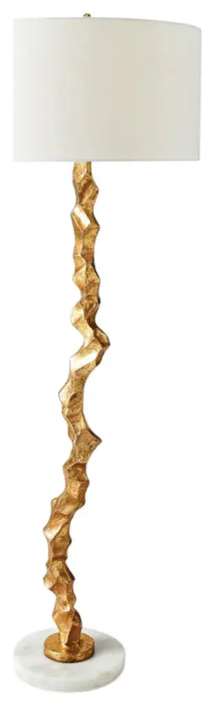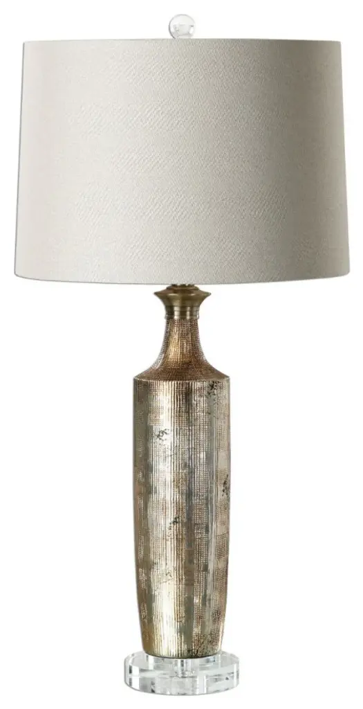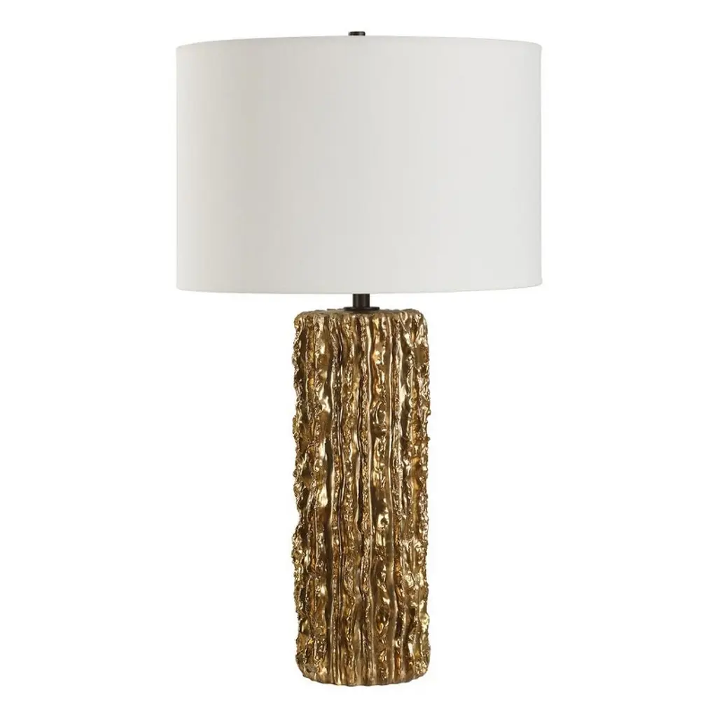 Uttermost Echo Table Lamp – Textured Metallic Gold Base with Black Accents and Linen Shade, 28” High, 3-Way Light Control Make a bold design statement with the Uttermost Echo Table Lamp, a sculptural piece that blends texture, metallic brilliance, and contrast. The heavily antiqued metallic gold ceramic base features deep channels and jagged edges, creating an almost volcanic texture that draws the eye. Black iron accents add depth and edge, while the white linen drum shade softens the overall aesthetic with balanced light diffusion. Standing 28 inches high, and paired with a 10-inch high, 16-inch diameter shade, this lamp is ideal for side tables, entry consoles, or as a focal point in modern living spaces. Every detail evokes luxury with artistic flair.Key Benefits: Dramatic Design: Bold metallic texture and black contrast for visual impact Customizable Lighting: 3-way socket allows light adjustment for mood or task Versatile Use: Ideal for living rooms, offices, bedrooms, or entry tables High-End Look: Sculptural form mimics custom designer pieces Perfect Proportions: 28” H with 16” Dia shade offers both height and balance