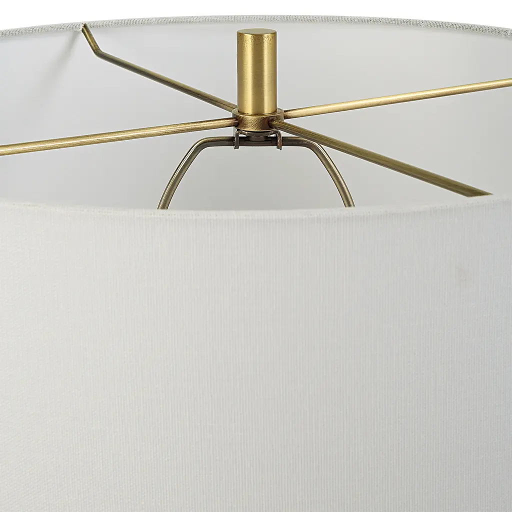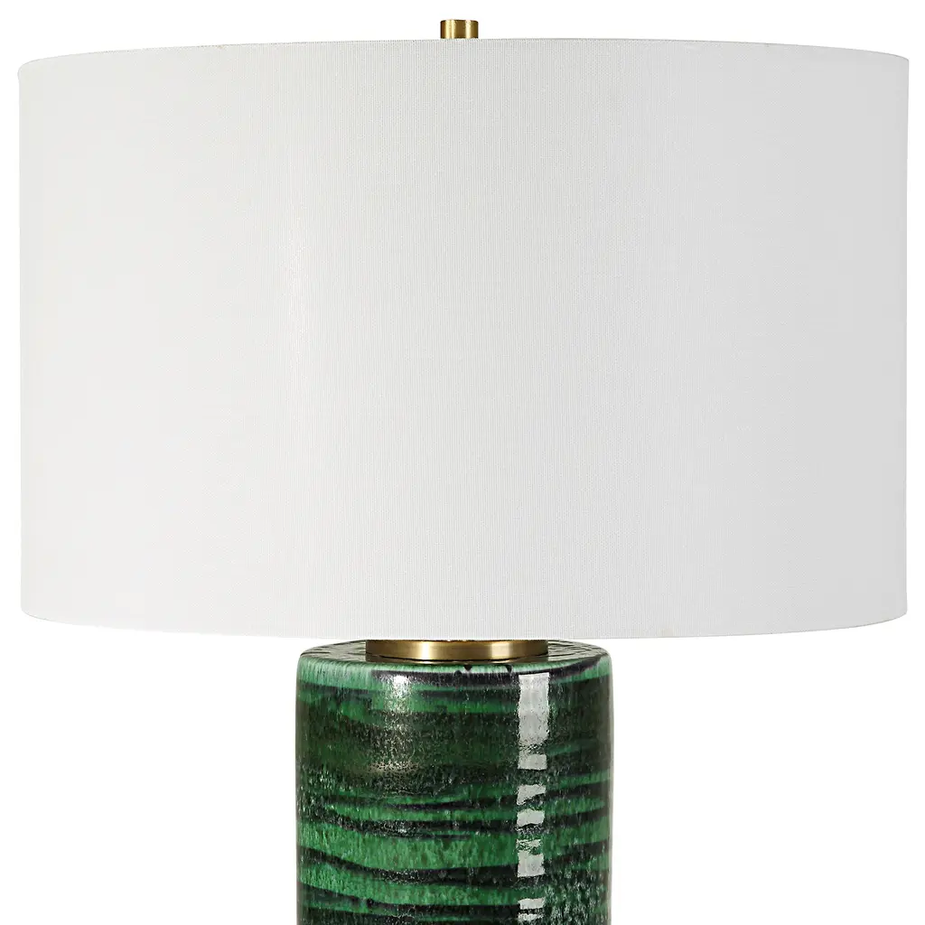 This table lamp features a ceramic base finished in a two-toned dark and light emerald green glaze with an abstract stripe pattern, accented with antique brass plated details. Round drum shade has a casual white linen fabric with natural slubbing. Due to the nature of fired glazes on ceramic lamps, finishes will vary slightly. Uttermost's lamps combine premium quality materials with unique high-style design. With the advanced product engineering and packaging reinforcement, Uttermost maintains some of the lowest damage rates in the industry. Each product is designed, manufactured and packaged with shipping in mind. Features: Includes: One (1) Table Lamp Collection: Galeno Material: Ceramic, Iron, Fabric Shade: Round Drum Hardback Shade Wattage: 150W Bulb Type: A 1 Light - 1 Bulb required Socket type: 3-WAY Designer: Carolyn Kinder No assembly required Dimensions: Dimensions: 27.75 inches high x 17 inches wide x 17 inches deep Shade size: Height: 10 inches, Top: 17 inches wide x 17 inches deep, Bottom: 17 inches wide x 17 inches deep Item weight: 8 lbs This product will be shipped to you in one (1) box. Accessories pictured are NOT included. WARNING: This product can expose you to chemicals including nickel which is known to the State of California to cause cancer. For more information, go to www.P65Warnings.ca.gov/furniture.