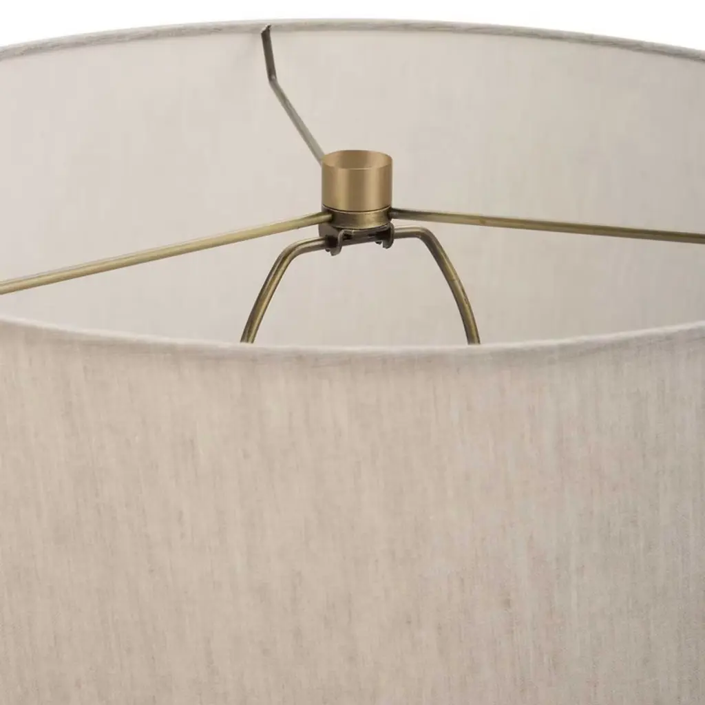 Gravitas Table Lamp-Sophisticated Design with Light Beige Linen Shade True to its name, the Gravitas Table Lamp exudes poise and refinement. Anchored by a slender iron column in a plated brushed brass finish, it is topped with a porous ivory stone detail that lends organic charm. A light beige linen shade with a subtle woven texture softens the silhouette and diffuses warm ambient light. Designed with timeless materials and elegant proportions, this lamp adds an understated yet powerful presence to any room. Key Features: Refined Iron Base: Brushed brass plated finish offers timeless elegance. Textural Stone Accent: Porous ivory stone detail adds organic contrast. Soft Ambient Lighting: Light beige linen shade provides a warm glow. Versatile Functionality: E26 socket supports up to 150W; 3-way switch for brightness control (bulb not included). Balanced Dimensions: Ideal for side tables, consoles, or nightstands. Dimensions: 27.5" H x 16" W x 16" D A perfect harmony of texture, tone, and light, this lamp complements contemporary and classic interiors alike.