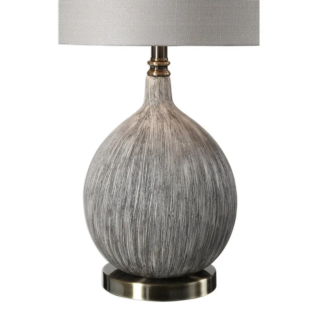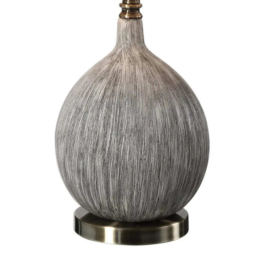The Uttermost Hedera Textured Ivory Table Lamp offers a refined mix of organic form and timeless design. Measuring 26.5 inches tall with a 14-inch square footprint, this lamp features a gourd-shaped ceramic base with a heavily textured surface finished in old ivory layered with aged black undertones. Accented with burnished brass plated metal, the design exudes quiet luxury and artistic depth. Topped with a round hardback drum shade in light beige linen with natural slubbing, it brings subtle warmth and softness to your lighting. Compatible with a 150W Type A bulb and a 3-way switch, it’s both functional and decorative — ideal for bedrooms, living rooms, or entryways. Key Features: Material: Ceramic, metal, and fabric construction Color: Old ivory with aged black undertones; brass accents; light beige shade Dimensions: 26.5" Height × 14" Width × 14" Depth Shade Details: Round hardback drum; 11" Height; Top/Bottom: 14" × 14" Voltage: 110V Socket Type: Type A; 3-way switch; 150W max Weight: 7.9 lbs Design Style: Organic modern, transitional, upscale casual