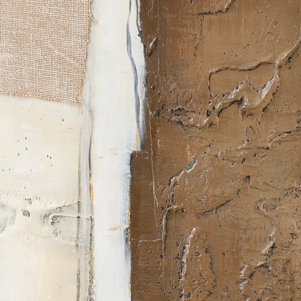 Interference hand-painted canvas is a striking abstract mixed media artwork that blends warm shades of chocolate brown and taupe. A slim, black gallery frame completes the piece. Due to the handcrafted nature of this artwork, each piece may have subtle differences. May be hung horizontally or vertically.