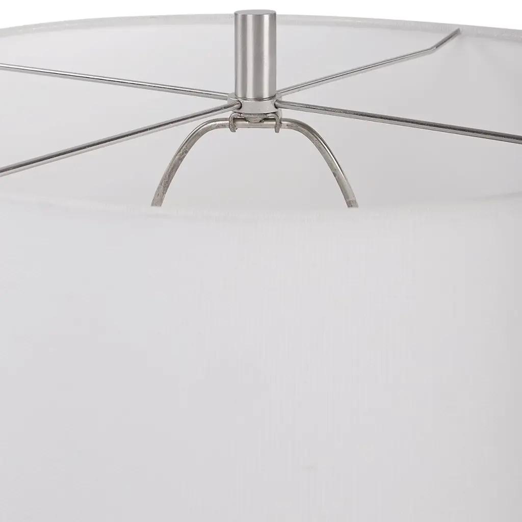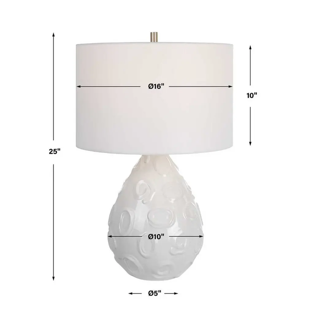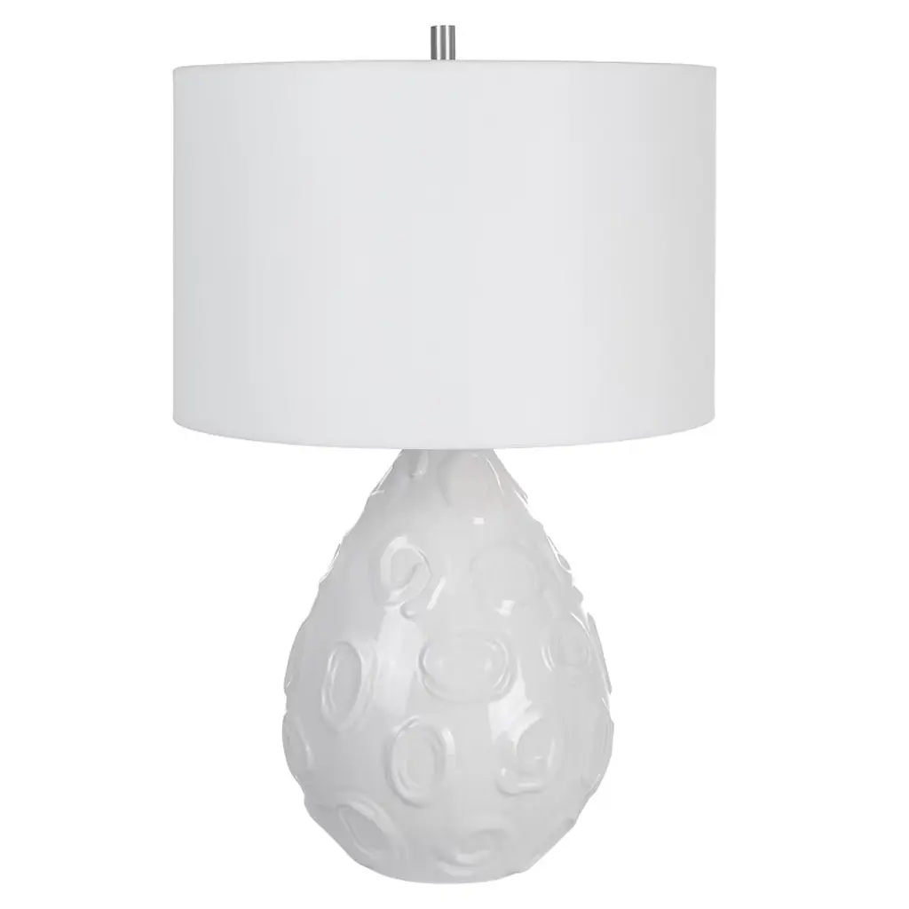 Elevate your home decor with the Uttermost Loop White Glaze Table Lamp. Handcrafted from ceramic, it features a clean white glaze adorned with individually applied whimsical loop details, complemented by plated brushed nickel accents. Measuring 25"H × 16"W × 16"D, this lamp fits perfectly on nightstands, side tables, or desks. The drum hardback shade with a rolled edge softly diffuses light, creating a cozy and sophisticated ambiance that enhances contemporary, modern, and eclectic interiors. Product Features: Material: Ceramic body with steel accents and fabric shadeColor: White glaze with brushed nickel detailsFinish/Frame: Handcrafted ceramic with whimsical loop patternDimensions: 25"H × 16"W × 16"DShade: Drum hardback with rolled edge, 10"H, top 16"W × 16"D, bottom 16"W × 16"DBulb: 150W, 1 TYPE A, 3-WAY socketStyle Match: Modern, contemporary, eclectic interiors