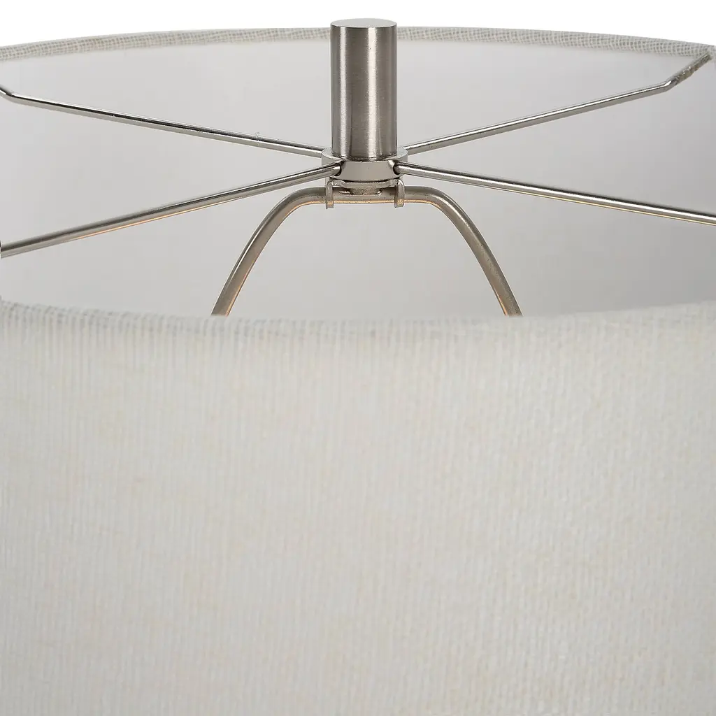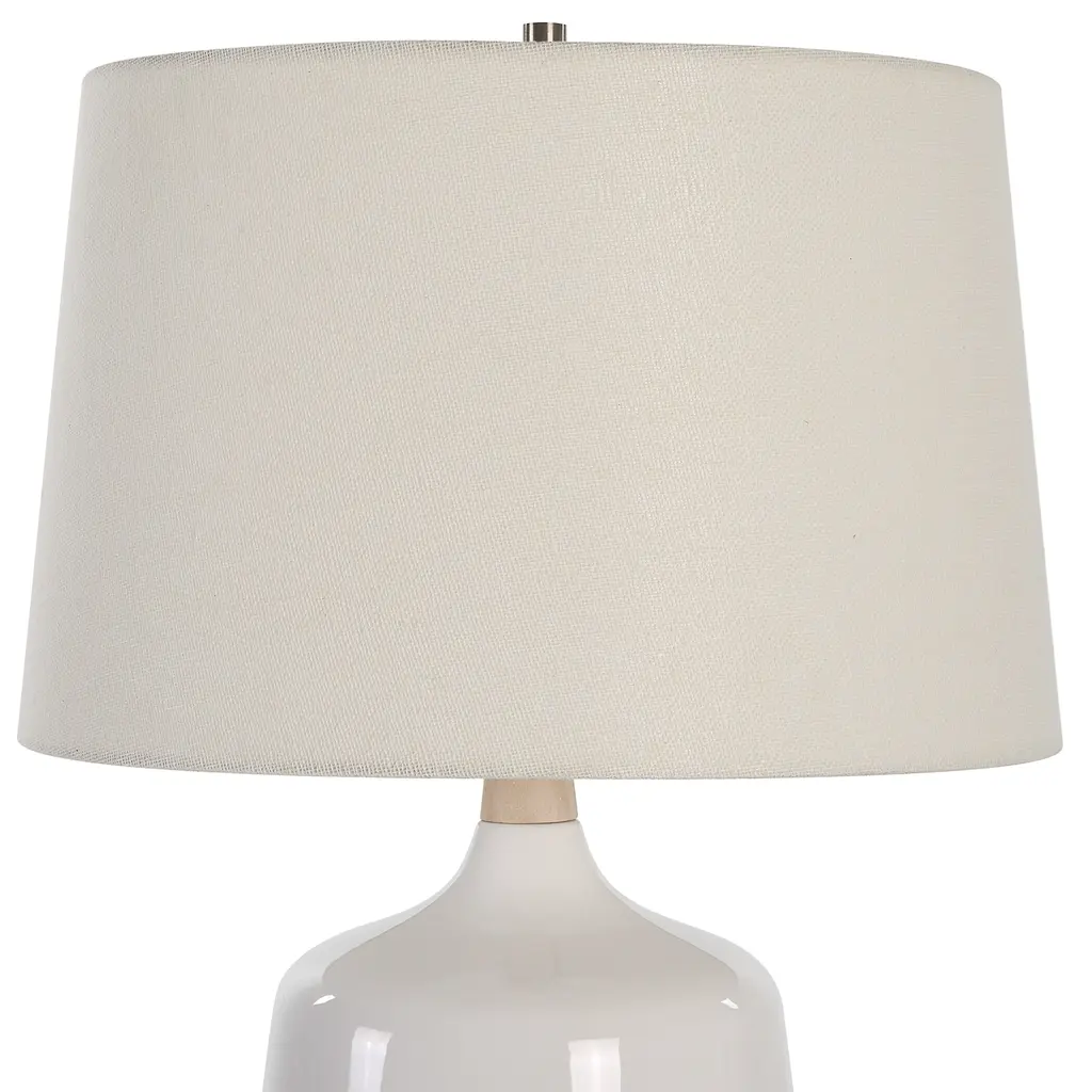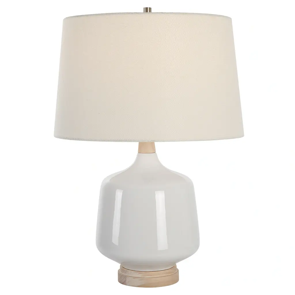 This ceramic table lamp featuring a white high gloss glaze accented by brushed nickel finishes. The natural wood base and neck adds organic elements to this versatile design. A slightly tapered off-white linen hardback shade completes the piece. Uttermost's lamps combine premium quality materials with unique high-style design. With the advanced product engineering and packaging reinforcement, Uttermost maintains some of the lowest damage rates in the industry. Each product is designed, manufactured and packaged with shipping in mind. Features: Includes: One (1) Table Lamp Collection: Opal Material: Wood, Ceramic, Fabric Shade: Round Hardback Shade Wattage: 150W Bulb Type: A 1 Light - 1 Bulb required Socket type: 3-WAY Designer: Osvaldo Mendoza No assembly required Dimensions: Dimensions: 24.5 inches high x 17 inches wide x 17 inches deep Shade size: Height: 10.5 inches, Top: 15 inches wide x 15 inches deep, Bottom: 17 inches wide x 17 inches deep Item weight: 7 lbs This product will be shipped to you in one (1) box. Accessories pictured are NOT included. WARNING: This product can expose you to chemicals including nickel which is known to the State of California to cause cancer. For more information, go to www.P65Warnings.ca.gov/furniture.
