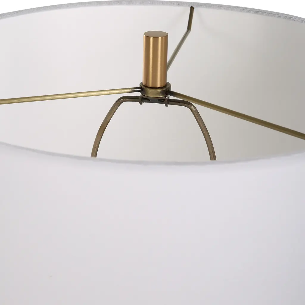This table lamp combines modern silhouette with organic textures and materials featuring two cone shaped pieces of light beige travertine separated by iron details finished in plated brushed brass. The slightly tapered round hardback shade is covered in white linen fabric. Uttermost's lamps combine premium quality materials with unique high-style design. With the advanced product engineering and packaging reinforcement, Uttermost maintains some of the lowest damage rates in the industry. Each product is designed, manufactured and packaged with shipping in mind. Features: Includes: One (1) Table Lamp Collection: Palu Material: Iron, Travertine, Linen Shade: Round Hardback Shade Wattage: 150W Bulb Type: A 1 Light - 1 Bulb required Socket type: 3-WAY Designer: Carolyn Kinder No assembly required Dimensions: Dimensions: 37.5 inches high x 16 inches wide x 16 inches deep Shade size: Height: 11 inches, Top: 15 inches wide x 15 inches deep, Bottom: 16 inches wide x 16 inches deep Item weight: 8 lbs This product will be shipped to you in one (1) box. Accessories pictured are NOT included. WARNING: This product can expose you to chemicals including nickel which is known to the State of California to cause cancer. For more information, go to www.P65Warnings.ca.gov/furniture.