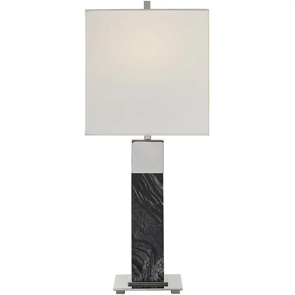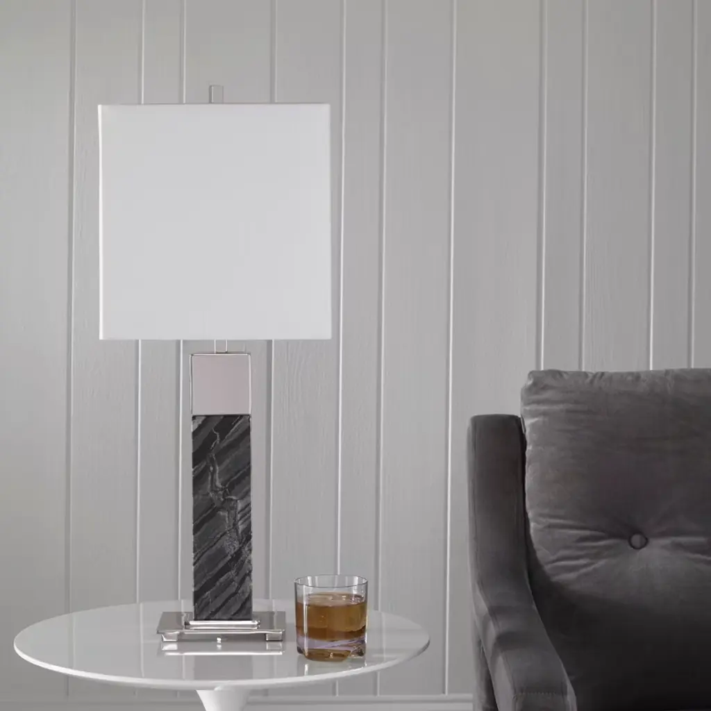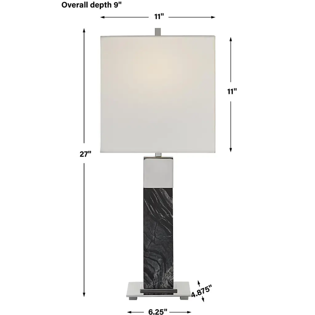 Add timeless elegance to your space with the Uttermost Pilaster Black Marble Table Lamp. This lamp features a sleek black marble column with natural gray and white veining, accented by polished nickel-plated finishes for a refined contemporary touch. The rectangular hardback shade in crisp white linen diffuses light softly, creating a warm and inviting ambiance. Perfectly sized at 9"D × 11"W × 27"H, it’s an ideal accent for bedrooms, living rooms, or offices. Designed by Osvaldo Mendoza, this lamp blends classic sophistication with modern functionality, featuring a Type A 100W ON-OFF socket for simple, effective lighting. Product Features Elegant black marble column with natural gray and white veiningPolished nickel-plated accents for modern eleganceDimensions: 9"D × 11"W × 27"HWeight: 9 lbsRectangular hardback white linen shadeShade size: 11"W × 9"D × 11"HBulb: 1 × 100W Type A (ON-OFF socket)Voltage: 110VCountry of Origin: ChinaDesigner: Osvaldo Mendoza