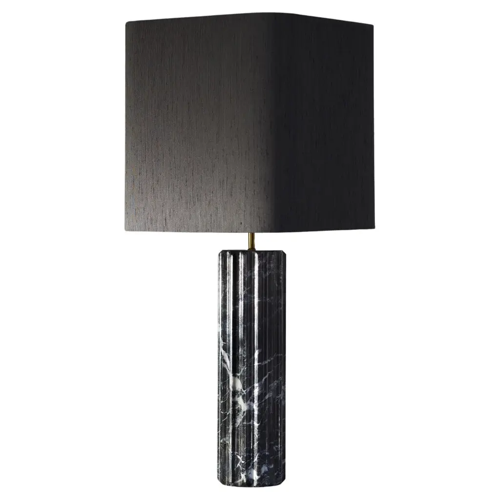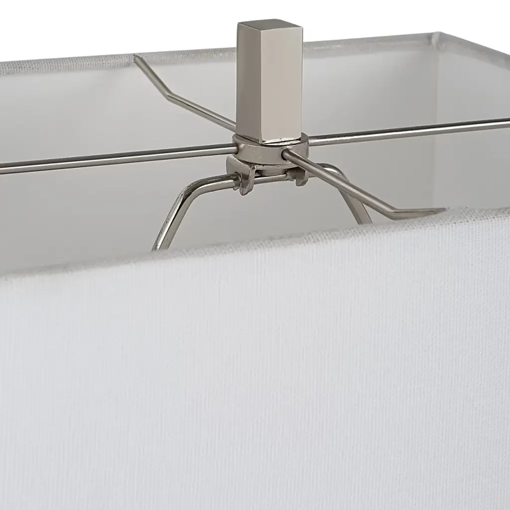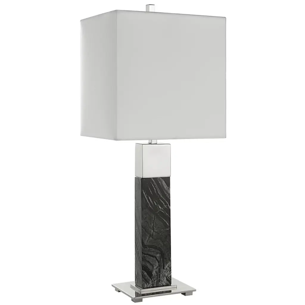 Add timeless elegance to your space with the Uttermost Pilaster Black Marble Table Lamp. This lamp features a sleek black marble column with natural gray and white veining, accented by polished nickel-plated finishes for a refined contemporary touch. The rectangular hardback shade in crisp white linen diffuses light softly, creating a warm and inviting ambiance. Perfectly sized at 9"D × 11"W × 27"H, it’s an ideal accent for bedrooms, living rooms, or offices. Designed by Osvaldo Mendoza, this lamp blends classic sophistication with modern functionality, featuring a Type A 100W ON-OFF socket for simple, effective lighting. Product Features Elegant black marble column with natural gray and white veiningPolished nickel-plated accents for modern eleganceDimensions: 9"D × 11"W × 27"HWeight: 9 lbsRectangular hardback white linen shadeShade size: 11"W × 9"D × 11"HBulb: 1 × 100W Type A (ON-OFF socket)Voltage: 110VCountry of Origin: ChinaDesigner: Osvaldo Mendoza