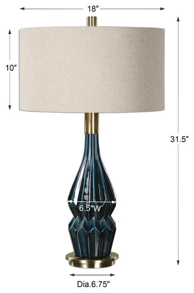 Deep Blue Ceramic Glaze Accented With Plated, Brushed Antique Brass Details. The Round Hardback Drum Shade Is An Oatmeal Linen Fabric With Natural Slubbing. Due To The Nature Of Fired Glazes On Ceramic Lamps, Finishes Will Vary Slightly. Uttermost''s Lamps Combine Premium Quality Materials With Unique High-style Design. With The Advanced Product Engineering And Packaging Reinforcement, Uttermost Maintains Some Of The Lowest Damage Rates In The Industry. Each Product Is Designed, Manufactured And Packaged With Shipping In Mind. DimensionsDepth: 18 in. Width: 18 in. Height: 31. 5 in.