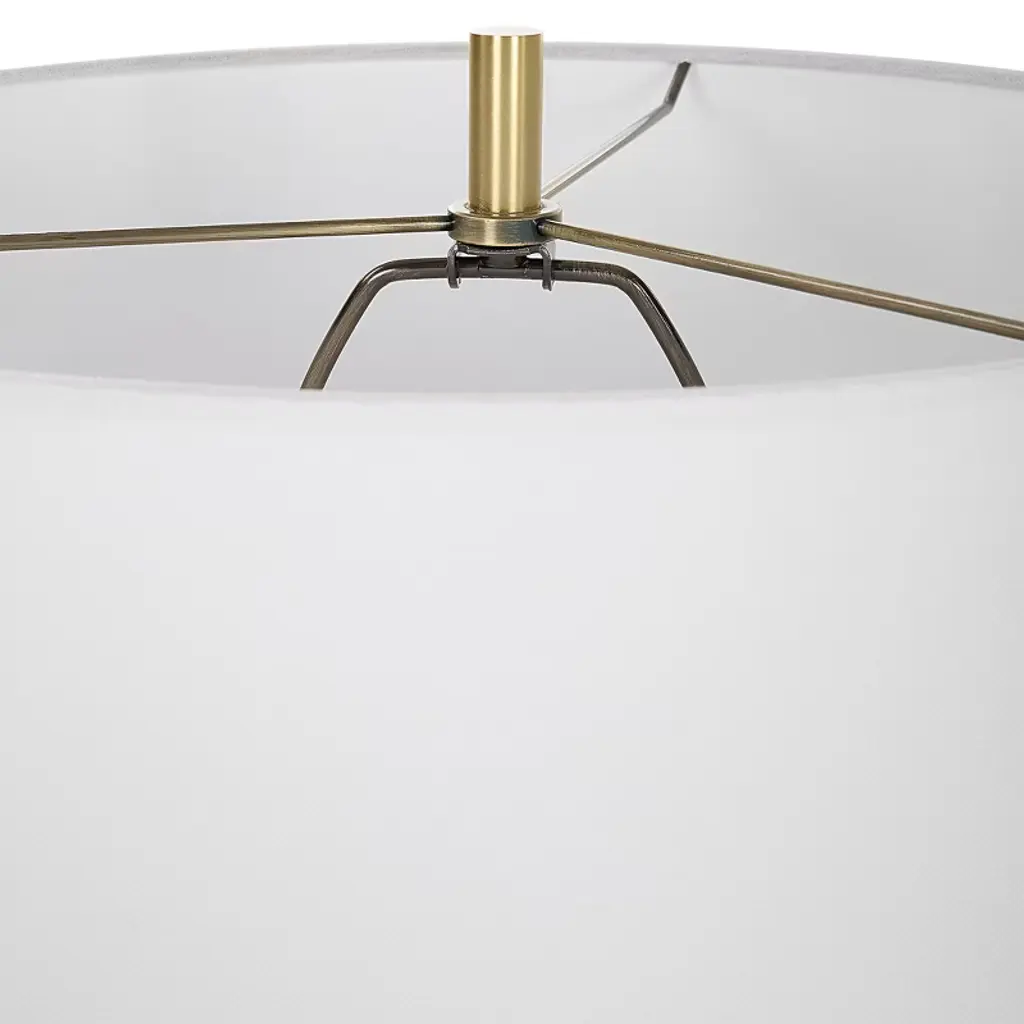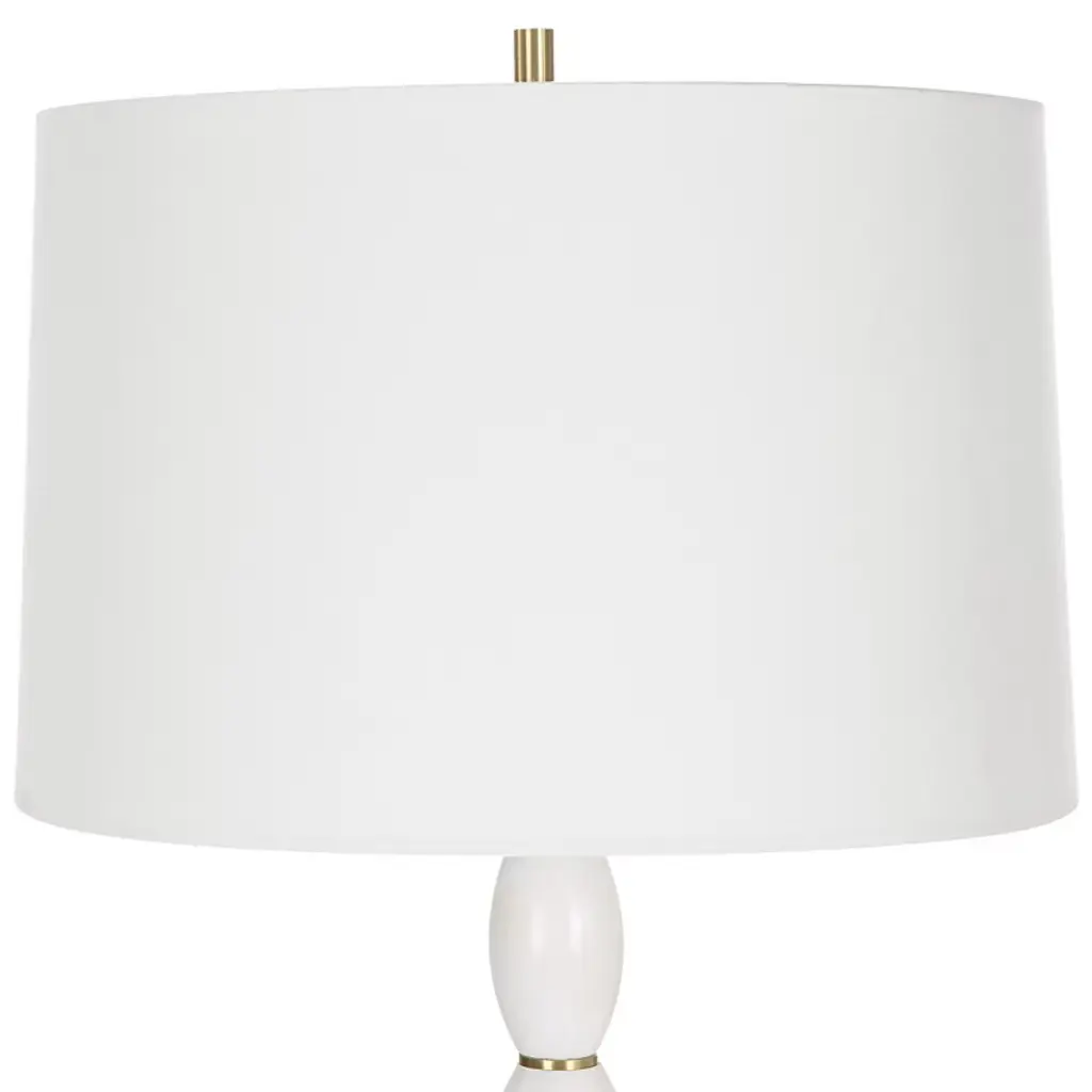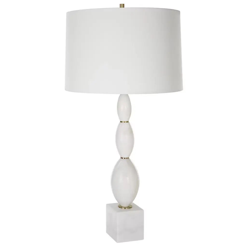 Exuding timeless elegance, the Uttermost Regalia Table Lamp features a beaded white marble base displayed atop a matching marble foot, enhanced with antique brushed brass accents. The slightly tapered white linen hardback drum shade provides soft, ambient illumination. Perfect for living rooms, bedrooms, or offices, this lamp is a sophisticated statement piece that blends classic luxury with modern design. Key Benefits: Material: Marble, iron, fabricColor: White marble base, antique brass accents, white shadeDimensions: 31.25"H × 16"W × 16"DShade: Round hardback, 10"H, top 15"W × 15"D, bottom 16"W × 16"DBulb: 150W, 1 TYPE A, 3-WAY socketDesigner: Carolyn KinderCountry of Origin: China