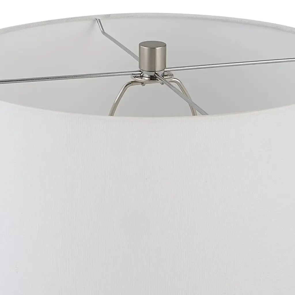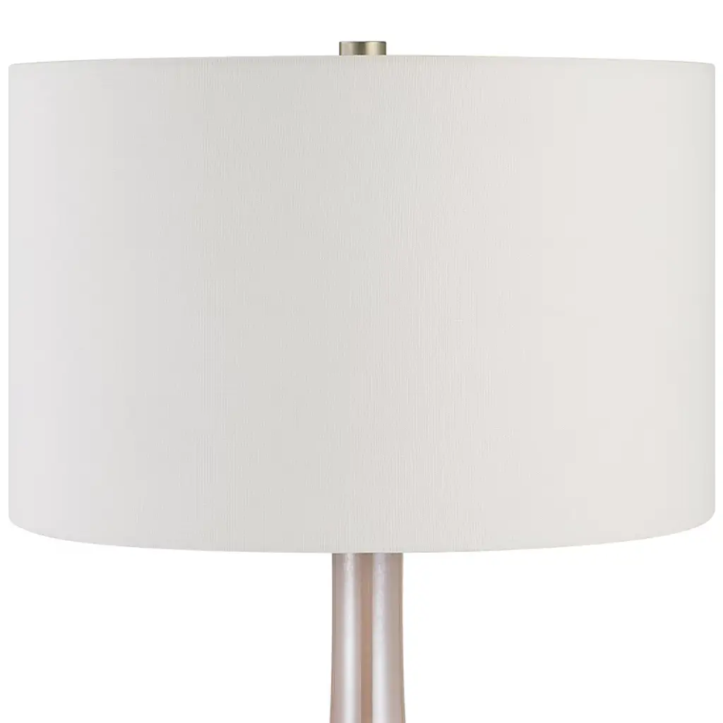 Bring a soft, elegant touch to your home with the Uttermost Rosa Pink Glass Table Lamp. The lamp features a light blush pink glass base accented with crystal details and brushed nickel-finished iron, creating a sophisticated, contemporary look. Its round hardback drum shade in white cotton fabric diffuses light beautifully, providing a warm and inviting ambiance. Measuring 29"H × 16"W × 16"D, this lamp is perfect for bedside tables, desks, or accent tables, seamlessly complementing modern, transitional, and feminine decor schemes. Product Features: Material: Glass base with crystal accents, brushed nickel iron, cotton fabric shadeColor: Blush pink glass, brushed nickel, white shadeFinish/Frame: Brushed nickel iron accents with crystal detailingDimensions: 29"H × 16"W × 16"DShade: Round hardback drum, 10"H, top 16"W × 16"D, bottom 16"W × 16"DBulb: 150W, 1 TYPE A, 3-way socketStyle Match: Contemporary, transitional, feminine interiors