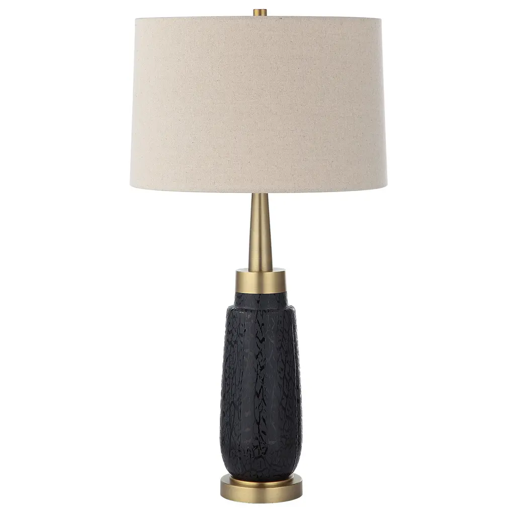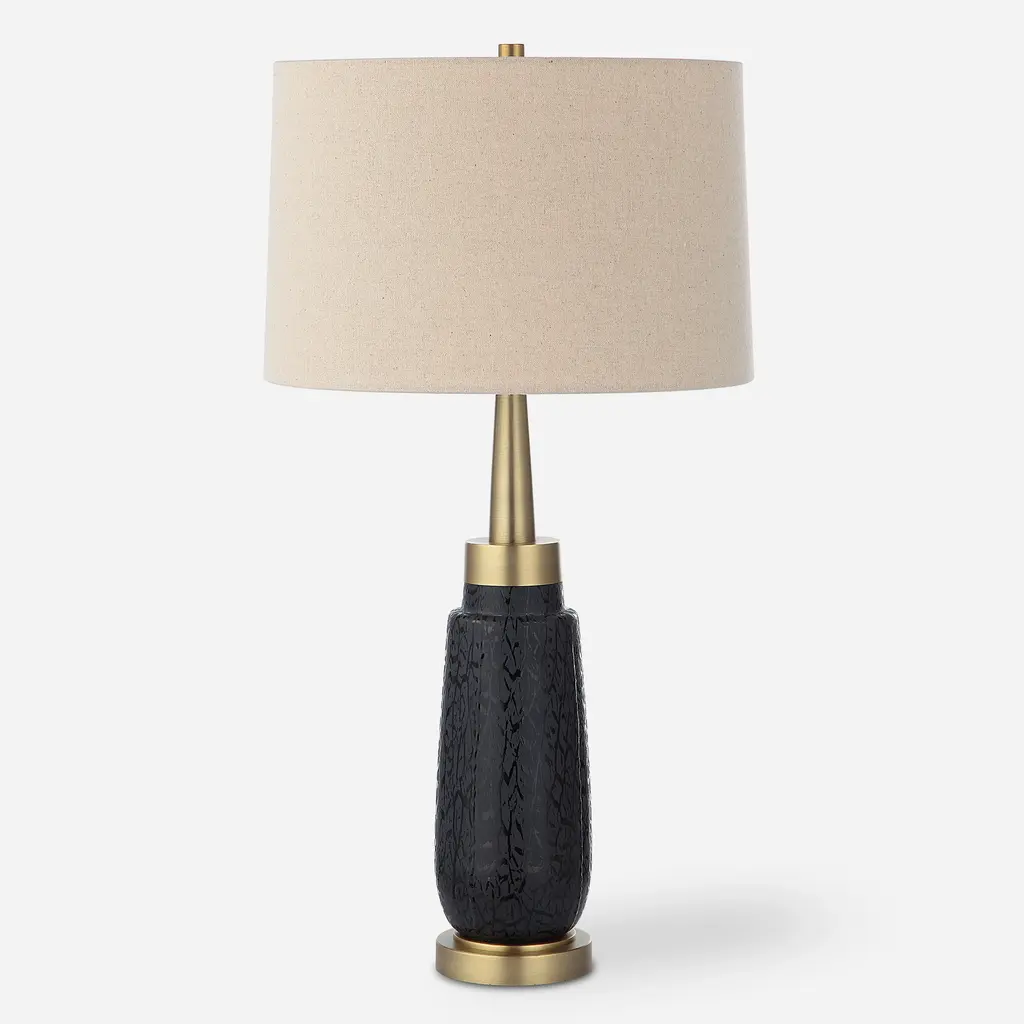 The Spyglass Table Lamp features a matte black glass base with polished black woodgrain-like etching, paired with lightly antiqued brass plated foot and hardware. The round hardback shade is covered in a light beige linen fabric. Uttermost's lamps combine premium quality materials with unique high-style design. With the advanced product engineering and packaging reinforcement, Uttermost maintains some of the lowest damage rates in the industry. Each product is designed, manufactured and packaged with shipping in mind. Features: Include: One (1) Table Lamp Collection: Spyglass Material: Glass, Iron, Fabric Shade: Round Hardback Shade Wattages: 150W Bulb type: E26 1 Light - 1 Buld required Socket type: 3-WAY Designer: Carolyn Kinder No assembly required Dimensions: Dimensions: 30.75 inches high x 16 inches wide x 16 inches deep Shade size: Height: 10 inches, Top: 15 inches wide x 15 inches deep, Bottom: 16 inches wide x 16 inches deep Item weight: 7 lbs This product will be shipped to you in one (1) box. Accessories pictured are NOT included. WARNING: This product can expose you to chemicals including nickel which is known to the State of California to cause cancer. For more information, go to www.P65Warnings.ca.gov/furniture.