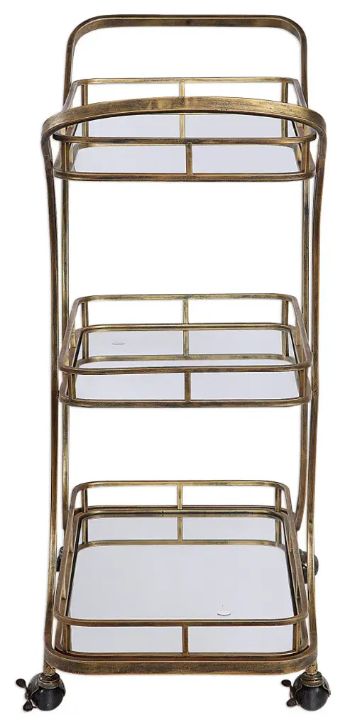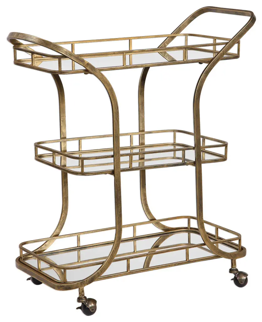 Hand Forged In Solid Iron, This Transitional Bar Cart Features Three Tray Style Mirrored Shelves Finished In Antiqued Gold, Complete With Rolling Casters.