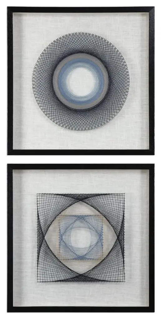 These Fun Shadow Boxes Feature 3-dimensional Layered String Art, Hand Threaded Around Individually Hammered Pin Nails In Easy Shades Of Blue, Over A Neutral Linen Backing With A Black Pine Frame. Uttermost''s Wall Art Combines Premium Quality Materials With Unique High-style Design. With The Advanced Product Engineering And Packaging Reinforcement, Uttermost Maintains Some Of The Lowest Damage Rates In The Industry. Each Product Is Designed, Manufactured And Packaged With Shipping In Mind. DimensionsDepth: 2. 5 in. Width: 23. 625 in. Height: 23. 625 in.
