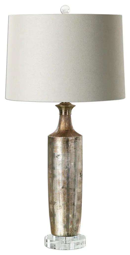 Add transitional style to your space with the Uttermost Valdieri Lamp. This ceramic piece features a bronze glaze with crystal accents. The tapered shade is made of beige linen fabric. Features: Voltage: 110Finish/Frame Description: Textured Ceramic Base Finished In A Metallic Bronze Glaze Accented With Crystal Details.Number of Lights: 1Shade Description: Slightly tapered round hardbackShade Size: Height: 10, Top: 14W x 14D, Bottom: 15W x 15DWattage: 150WBulb Quantity: 1Bulb Type: TYPE ASocket Type: 3-WAYBob and Belle Cooper founded The Uttermost Company in 1975, and it is still 100% owned by the Cooper family. The Uttermost mission is simple and timeless: to make great home accessories at reasonable prices. Inspired by award-winning designers, custom finishes, innovative product engineering and advanced packaging reinforcement, Uttermost continues to deliver on this mission. For over 30 years, Uttermost has enjoyed steady growth with over 200 employees working in its Rocky Mount, Virginia factories, totaling 600,000 square feet. It also has a factory in China and a state-of-the-art West Coast distribution center for increased capacity and faster shipping to West Coast retailers and customers. Uttermost is proud to support many of the world''s most prestigious customers with its products and services. Uttermost believes its success is largely based on its commitment to three key principles: providing superior customer service, maximizing product value through great design and sharp pricing and treating its employees, sales representatives and designers as partners in business.Bulb Type: TYPE A 3-WAYNumber of Bulbs: 1Bulbs Included: noUL Listed: yesBulb Wattage: 150WHardwire or Plug: plug