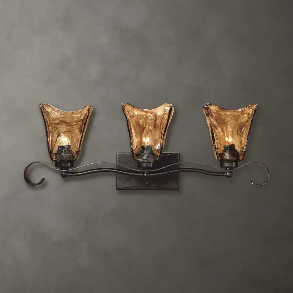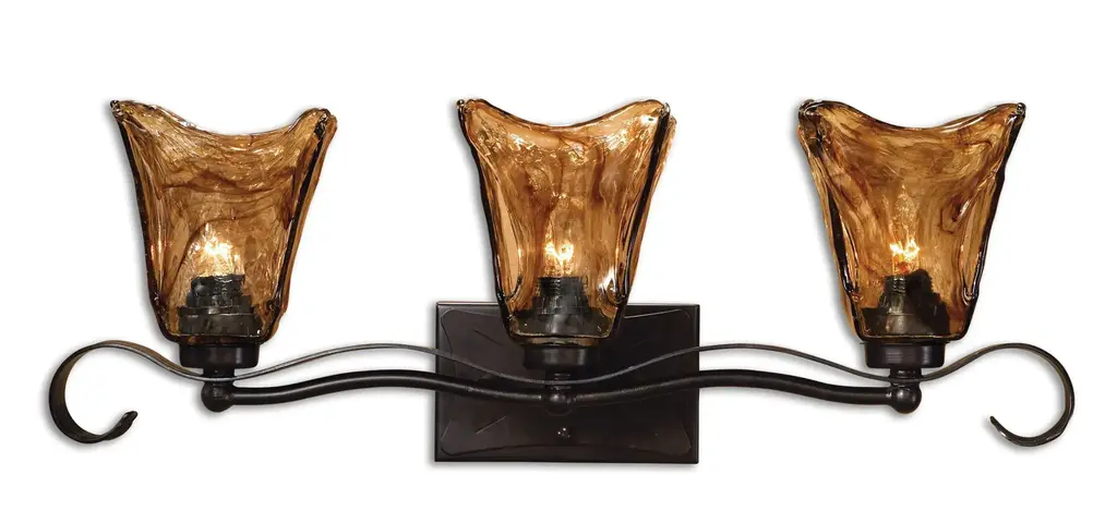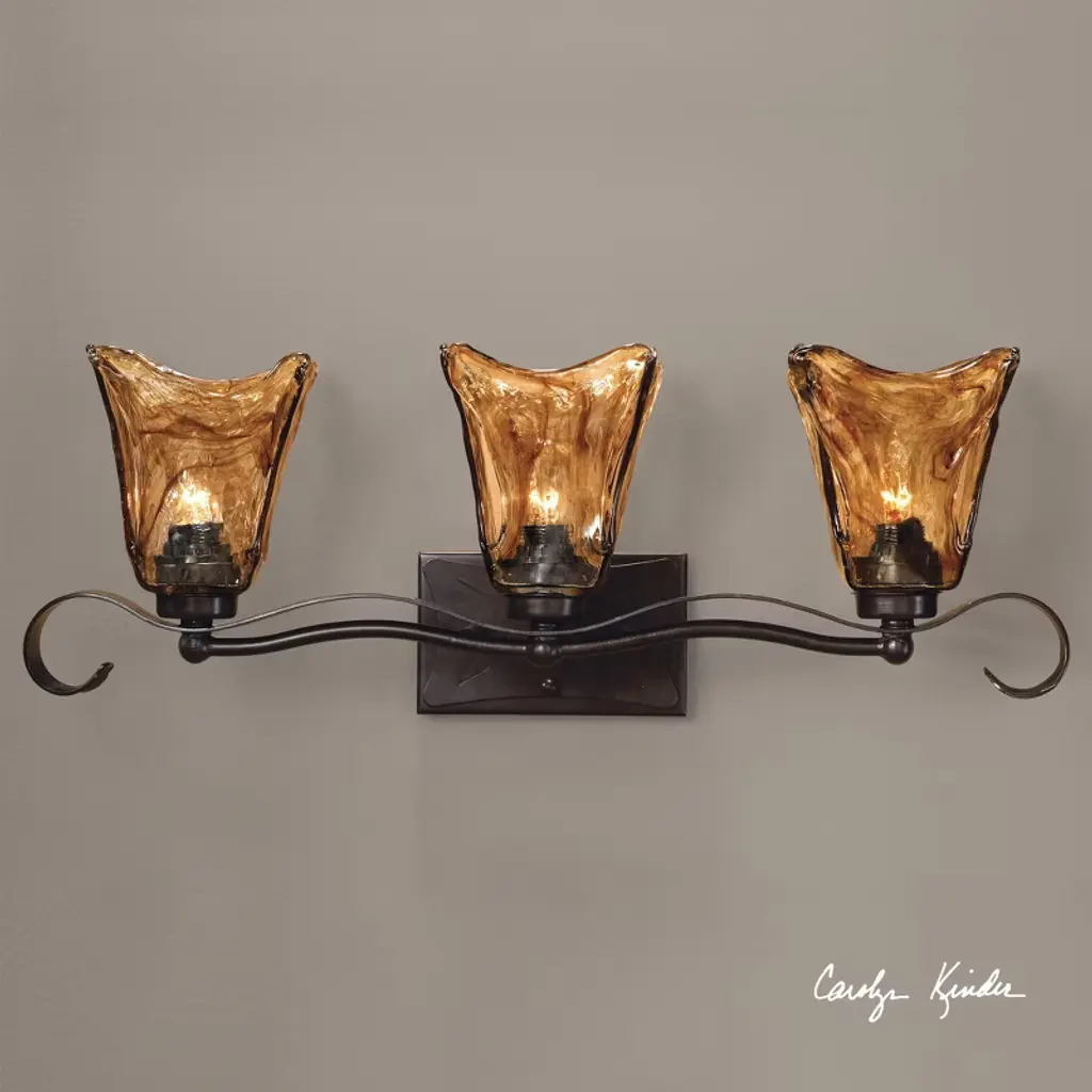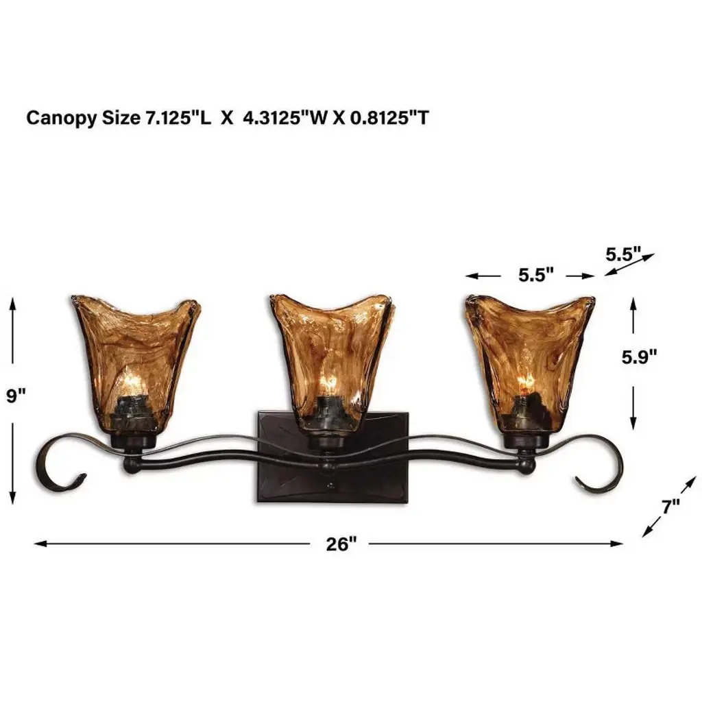 Uttermost Vetraio 3 Light Bronze Vanity Strip, 26"W x 9"H x 7"D, Metal and Glass, Contemporary European Style The Uttermost Vetraio 3 Light Vanity Strip features heavy handmade glass held in classic European iron work, offering a blend of contemporary design and traditional appeal. Perfect for bathrooms, dressing areas, or accent lighting, this vanity strip provides ample illumination with three 100W max Edison sockets. Bulbs are not included. Crafted from metal, brass, and glass, this durable fixture ensures lasting performance. Designed for indoor use, it is easy to install and maintain, making it a stylish and functional addition to any space. Key Features : Handmade Glass – Each piece features unique swirls and patterns for artistic elegance. Contemporary & Traditional Blend – European iron work adds timeless sophistication. Powerful Illumination – Three 100W Edison sockets provide bright, even light. Durable Materials – Metal, brass, and glass construction ensures stability. Indoor-Ready – Ideal for bathrooms, vanities, or accent lighting.