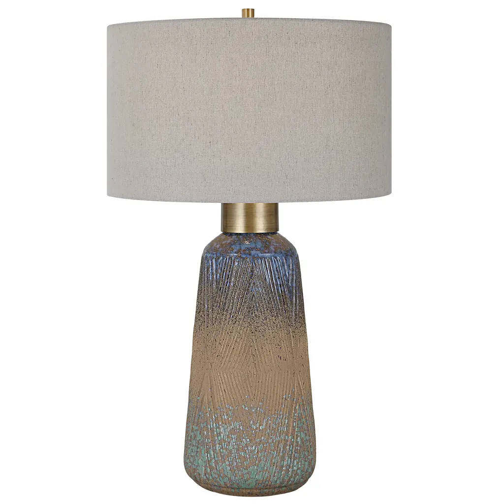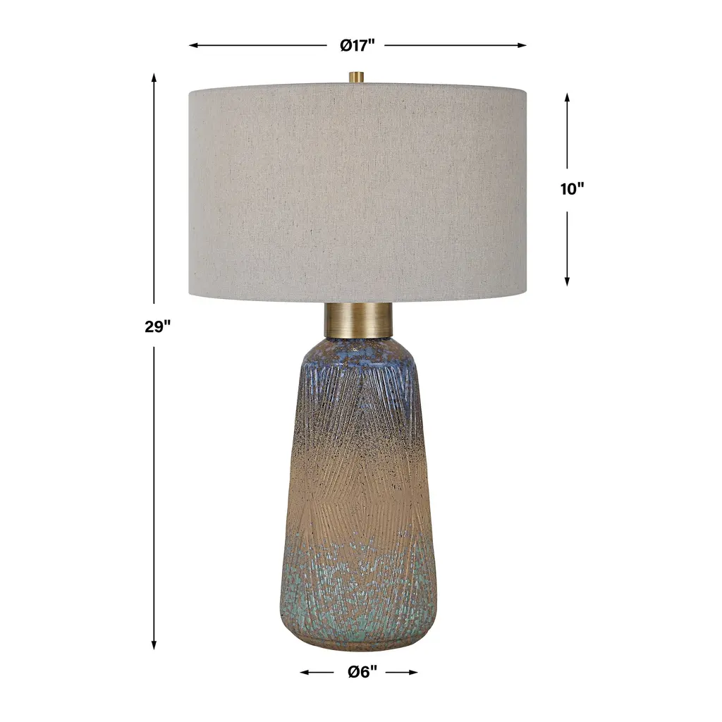 A beautiful display of color and style, this ceramic table lamp features an embossed design with a unique mix of matte and gloss glazes in various shades of blue-green, indigo, and golden rust, paired with antique brass plated details. The hardback drum shade is covered in a light gray linen fabric with natural slubbing. Uttermost's lamps combine premium quality materials with unique high-style design. With the advanced product engineering and packaging reinforcement, Uttermost maintains some of the lowest damage rates in the industry. Each product is designed, manufactured and packaged with shipping in mind. Features: Includes: One (1) Table Lamp Collection: Western Sky Material: Steel, Ceramic, Fabric Shade: Round Hardback Drum Wattage: 150W Bulb Type: A 1 Light - 1 Bulb required Socket type: 3-WAY Designer: Osvaldo Mendoza No assembly required Dimensions: Dimensions: 29 inches high x 17 inches wide x 17 inches deep Shade size: Height: 10 inches, Top: 17 inches wide x 17 inches deep, Bottom: 17 inches wide x 17 inches deep Item weight: 7 lbs This product will be shipped to you in one (1) box. Accessories pictured are NOT included. WARNING: This product can expose you to chemicals including nickel which is known to the State of California to cause cancer. For more information, go to www.P65Warnings.ca.gov/furniture.