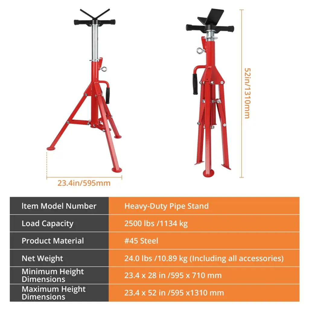 Heavy Duty Support: Designed to handle up to 2500 lbs, this V Head Pipe Jack Stand provides reliable and sturdy support for automotive, welding, and construction projects. Adjustable Height Range: Features an adjustable height from 28 to 52 inches, allowing versatile use for various tasks and ensuring optimal positioning and safety. Durable Steel Construction: Made from high-quality steel, this jack stand offers long-lasting durability and strength for heavy-duty applications including truck and trailer support. Foldable and Portable: The folding design makes it easy to store and transport, ideal for professionals and DIY enthusiasts who need a convenient and space-saving solution. Multi-Purpose Use: Perfect for use as jack stands, trailer jack stands, pipe stands, and pipe jack stands, making it a versatile tool for multiple heavy-duty lifting and support needs.