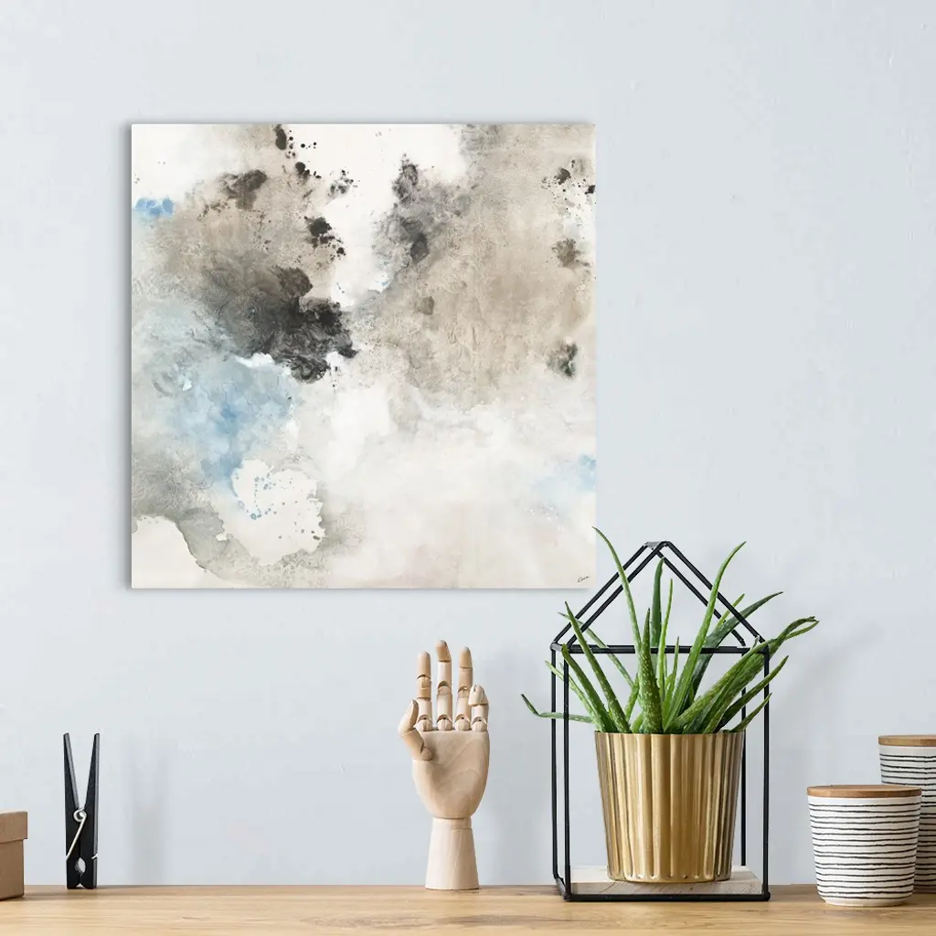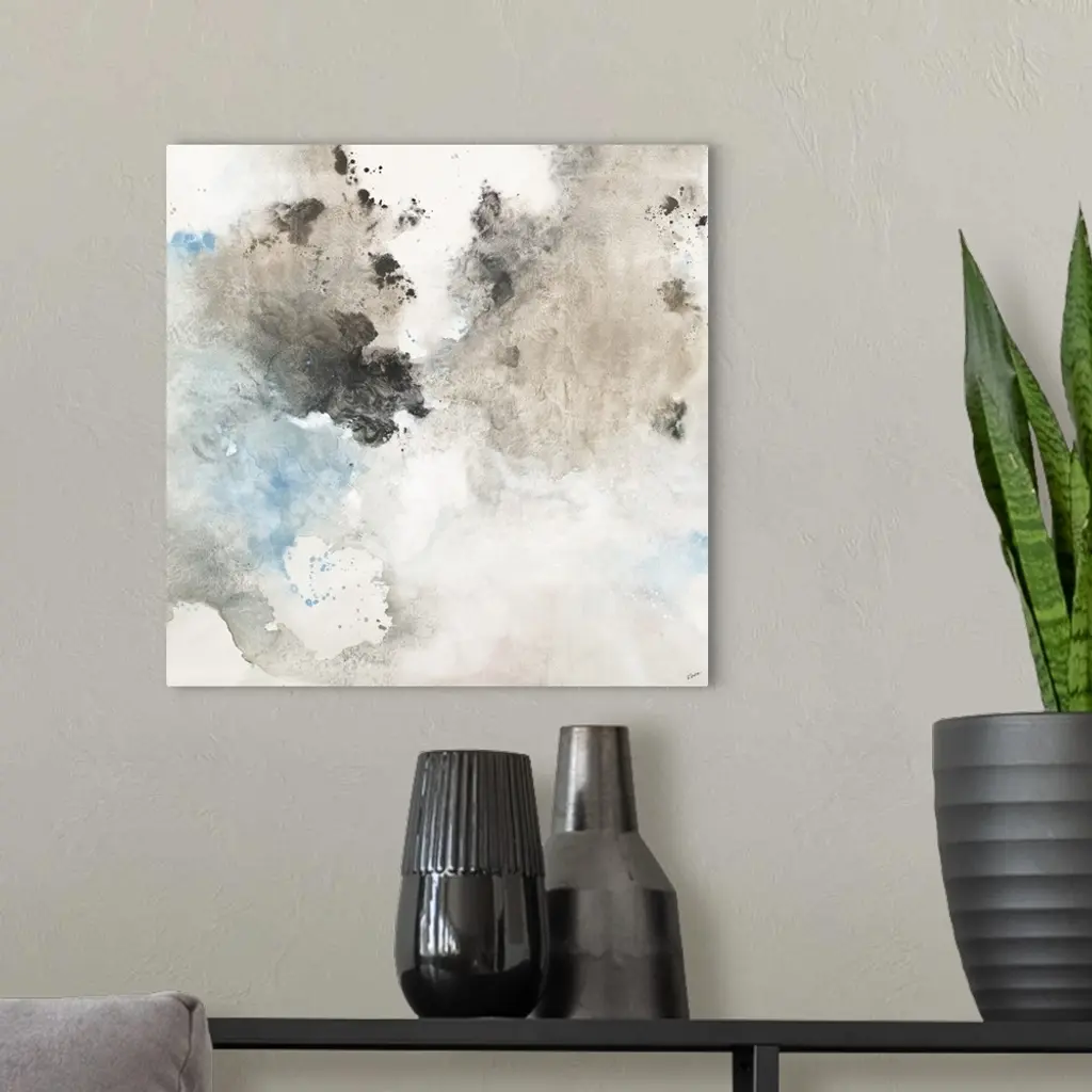 Square abstract decor with brown, black, gray, and blue splotches of color.