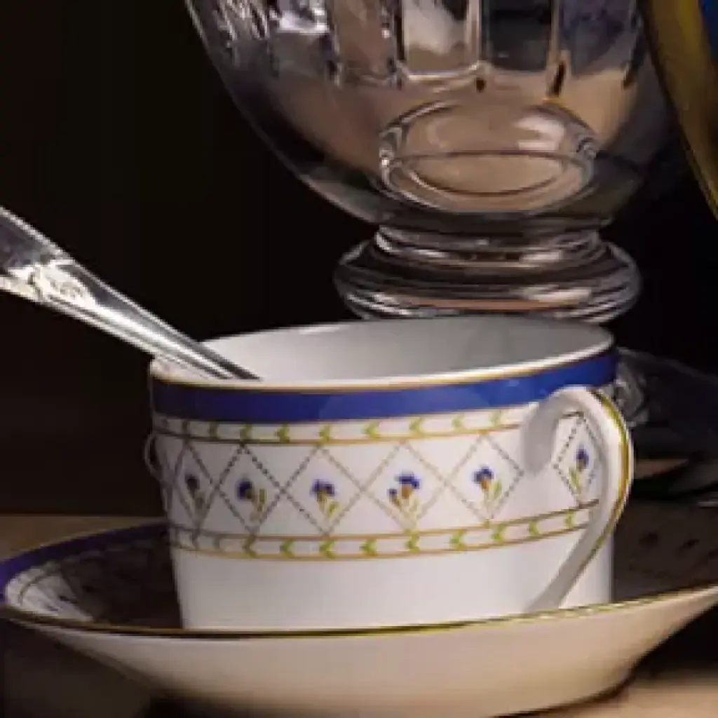 France's Loire valley is well known for it's beautiful flora. Lavender flowers are especially abundant. Haviland captures the essence of lavender flowers with the Val de Loire dinnerware. Tiny blue flowers adorn each piece, along with delicate designs and a gold rim. Five piece place setting includes dinner plate, salad/dessert plate, bread & butter plate, teacup and saucer. Haviland Porcelain was founded by David Haviland, an American who moved from New York to France after he was brought a broken tea cup to match and recognized the quality and color of the old piece of porcelain. Filled with curiosity, he went to France to find the factory where the cup had been made, but the samples he was sent were not up to his standards. So in 1841, he moved to Limoges to set up his own factory. Traditional French dinnerware was usually produced in Limoges and sent to Paris for decoration. Haviland insisted on setting up a studio within his factory to have more control over the designs. Renowned artists, including Cocteau, Dali, and Kandinsky have played a role in the company's designs. Today, Haviland is one of the premier names in French porcelain dinnerware, sought by collectors all over the world. Clients have included the White House, Empress Eugenie, General de Gaulle, Jacques Chirac, the Emperor of Japan, and the Royal Court of Morocco.