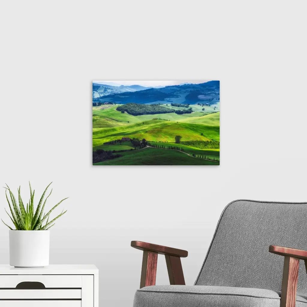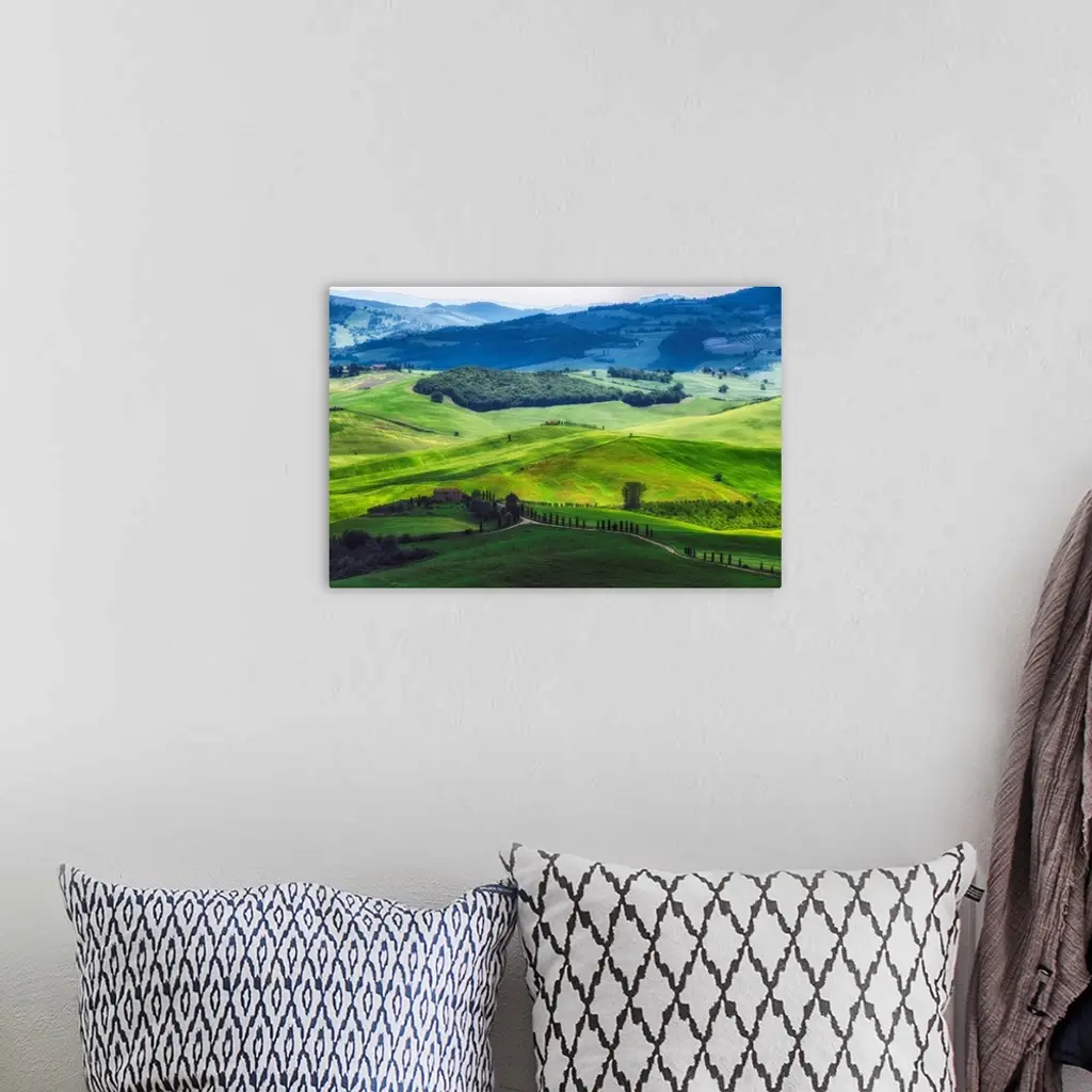 Rolling hills with farms, Val d'Orcia, Tuscany, Italy.