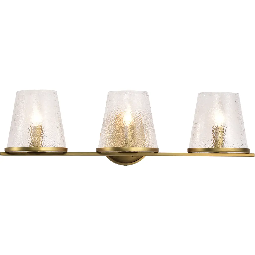 A warm glow with modern elegance, the Valentine 60-8263 three light vanity fixture is styled in an updated version of gas-lighting, a true past and present design for today's home lighting. With its striking combination of vintage inspiration and contemporary sophistication, it exudes warmth and style. Offered in a vintage brass finish, Valentine features distinctive hammered conical glass that creates a mesmerizing interplay of light and texture. Perfect for adding character and ambiance, it's a design that captures the essence of romance and enduring beauty.