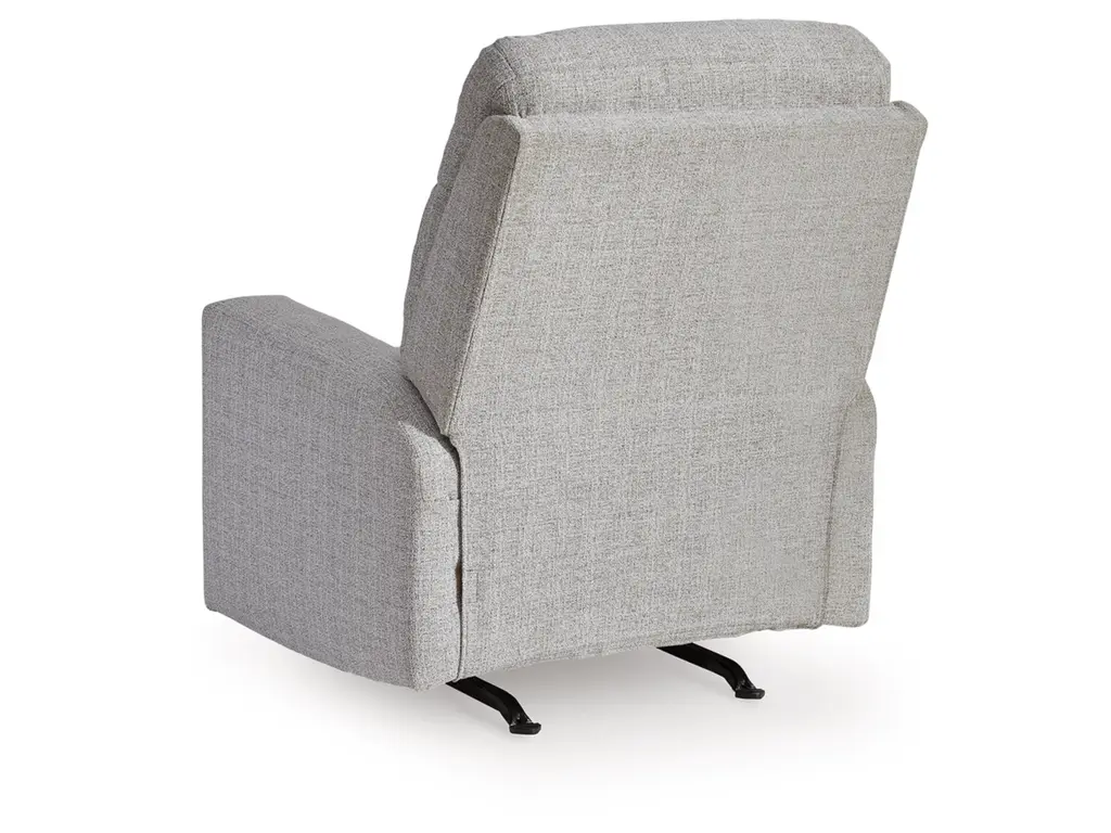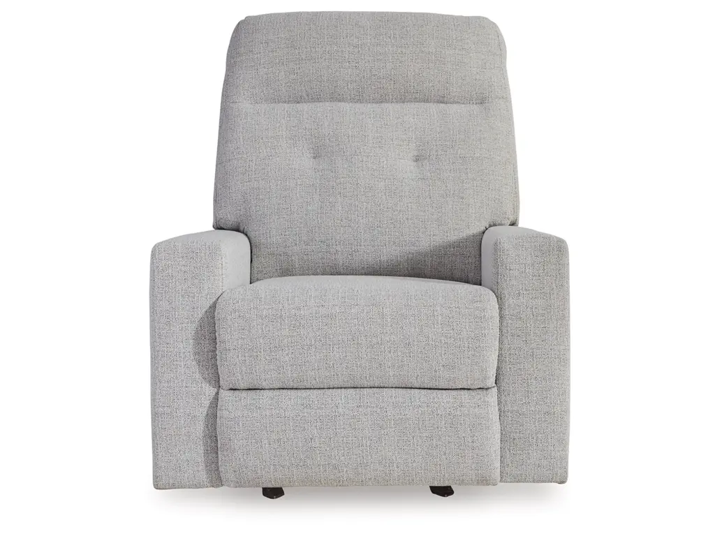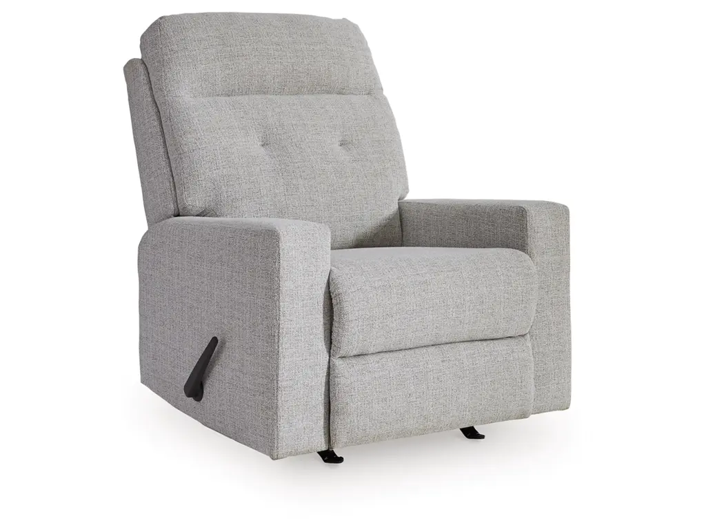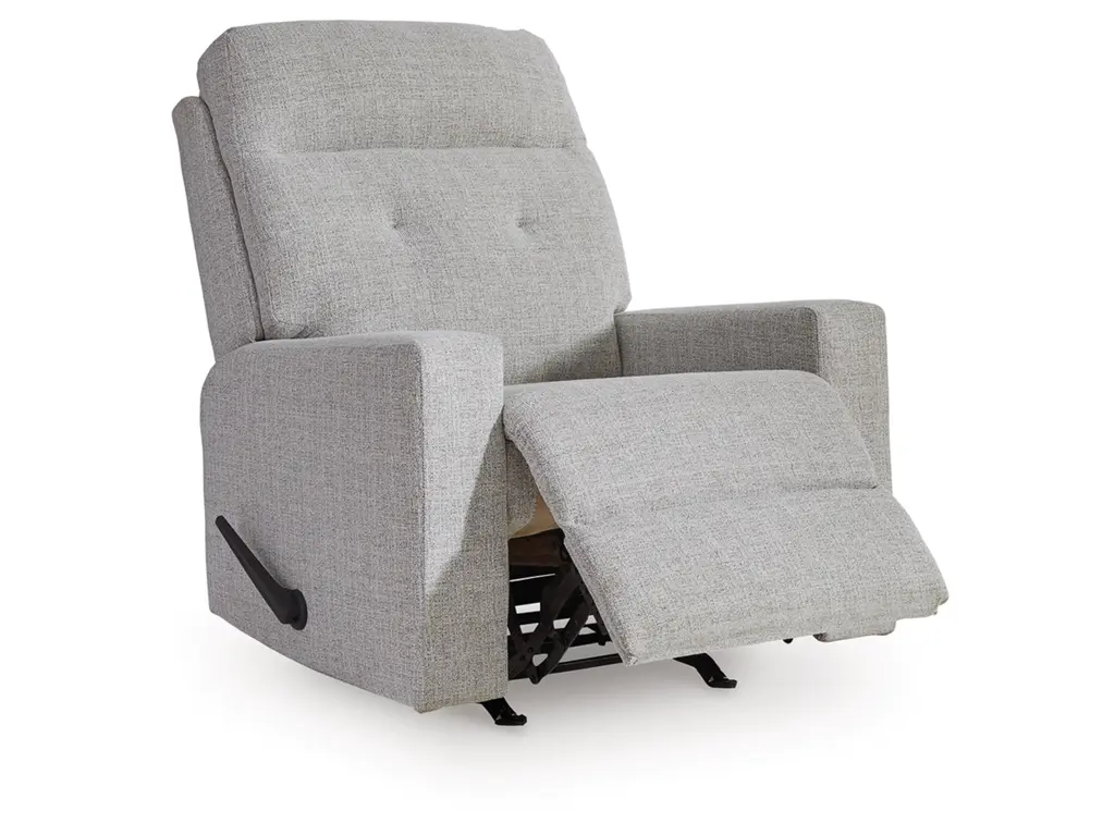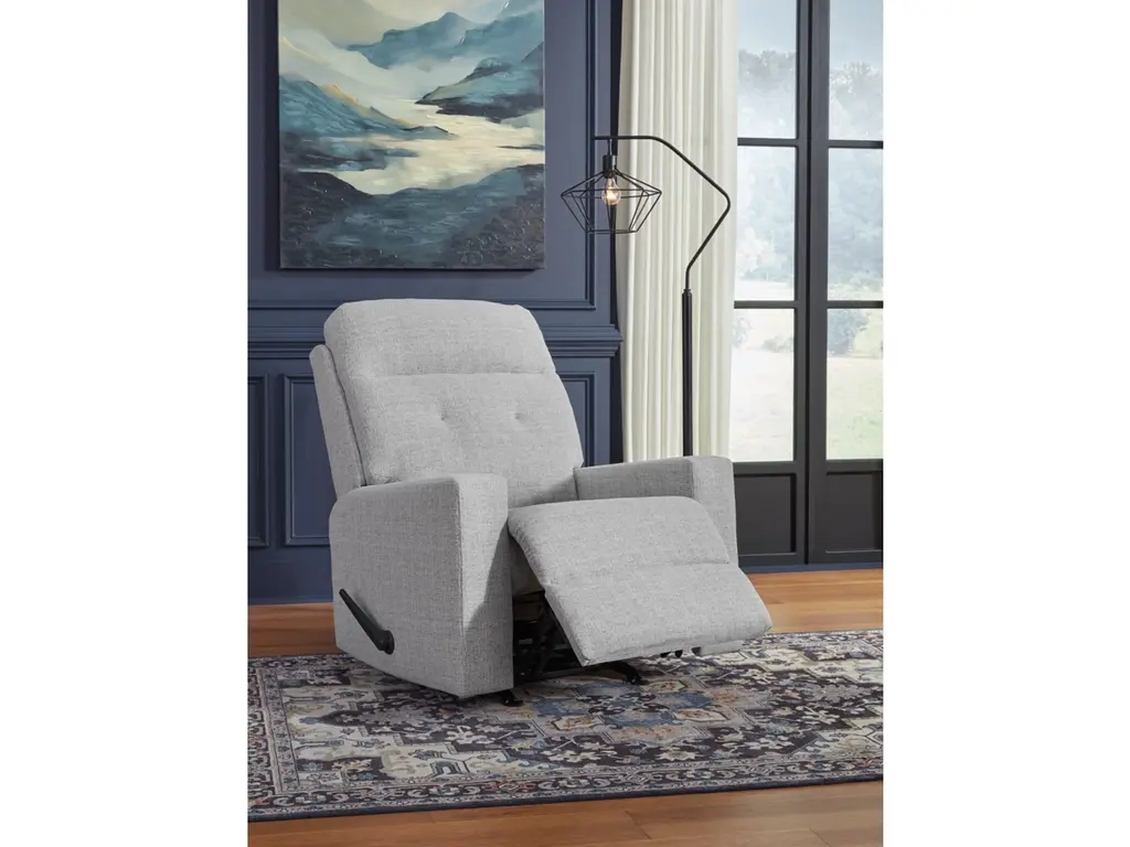 What happens when value meets plush comfort and contemporary design? The Valeview rocker recliner is born. Ample cushioning in all the right places makes this the best seat in the house, while updated track arms give a chic modern vibe. Pull tab reclining lets you kick back and unwind with ease. Covered in easy-to-clean Next-Gen Nuvella™ fabric, this recliner is perfect for nurseries and active households.