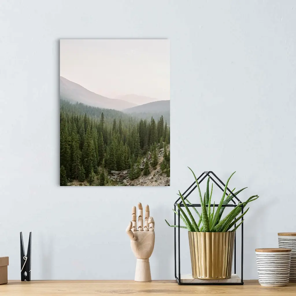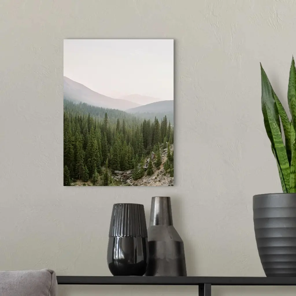 Photograph of a huge stretch of evergreen trees in a valley, Lake Louise, Canada