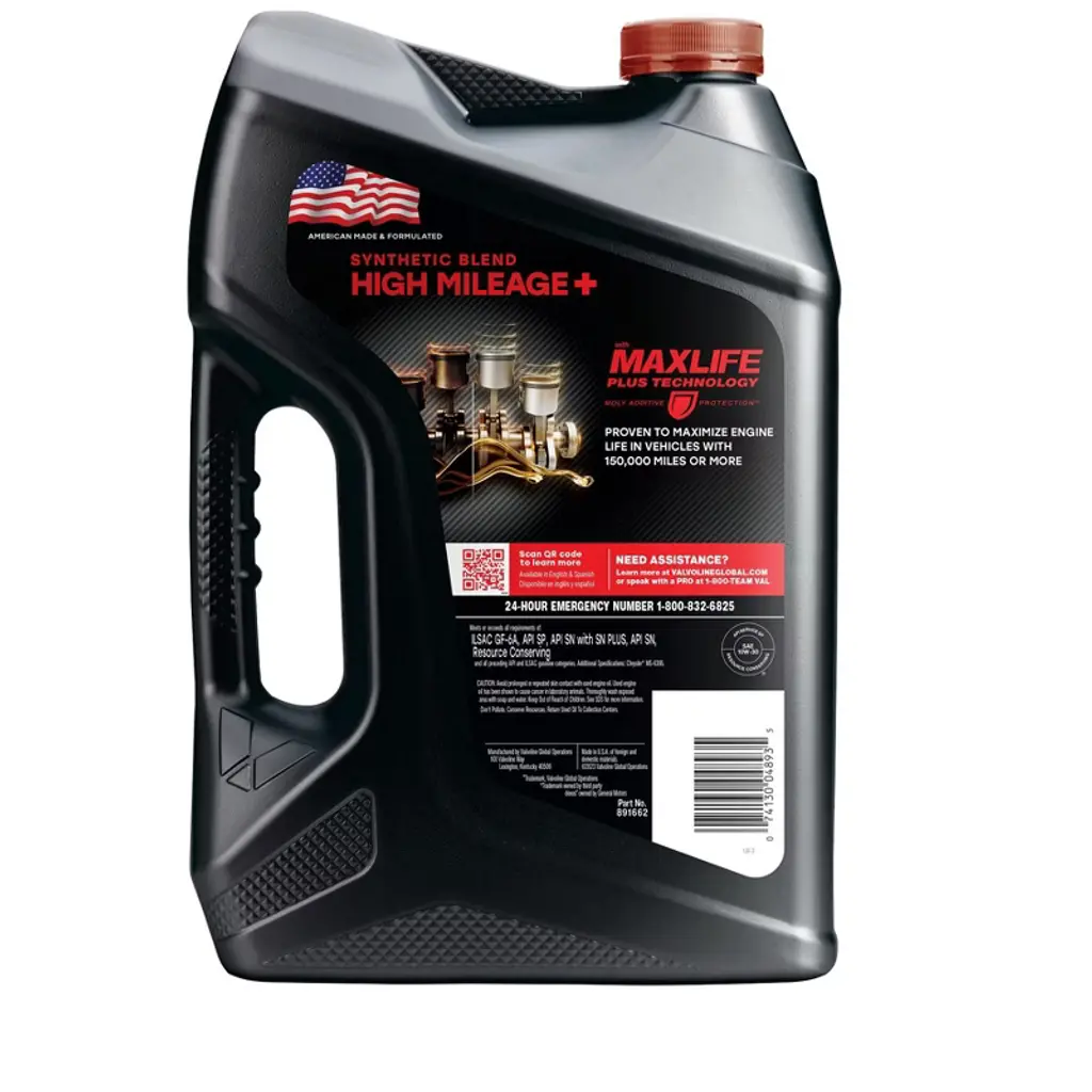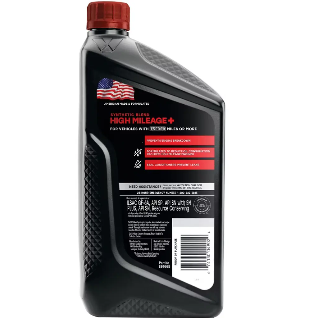 The average age of cars on the road is 12.5 years, and many have well over 100,000 miles. Valvoline High Mileage 150K with MaxLife Plus Technology can help keep those high-mileage motors running stronger for longer. It’s the first motor oil specially formulated to address the needs of engines with more than 150,000 miles. Aging engines have unique challenges like oil leaks, oil consumption due to blow-by, corrosion, a loss in power, significant wear, and excessive heat. Valvoline High Mileage 150K with MaxLife Plus Technology combines a blend of synthetic and premium conventional basestocks with seal conditioning agents to reduce oil consumption and stop smaller leaks before they become catastrophic. Designed with anti-wear Moly Additive Protection technology, it rapidly forms a film on critical metal engine surfaces to minimize friction, reduce heat, boost performance, and maximize efficiency. Our proprietary mixture of powerful cleaning agents and superior antioxidants help keep older engines clean of deposits and sludge, ensuring a smooth-running motor in extreme weather. Why just give your vehicle an oil change when you can increase its longevity with our best motor oil for older cars, Valvoline High Mileage 150K with MaxLife Plus Technology, in SAE 10W-30, 5W-20 and 5W-30.