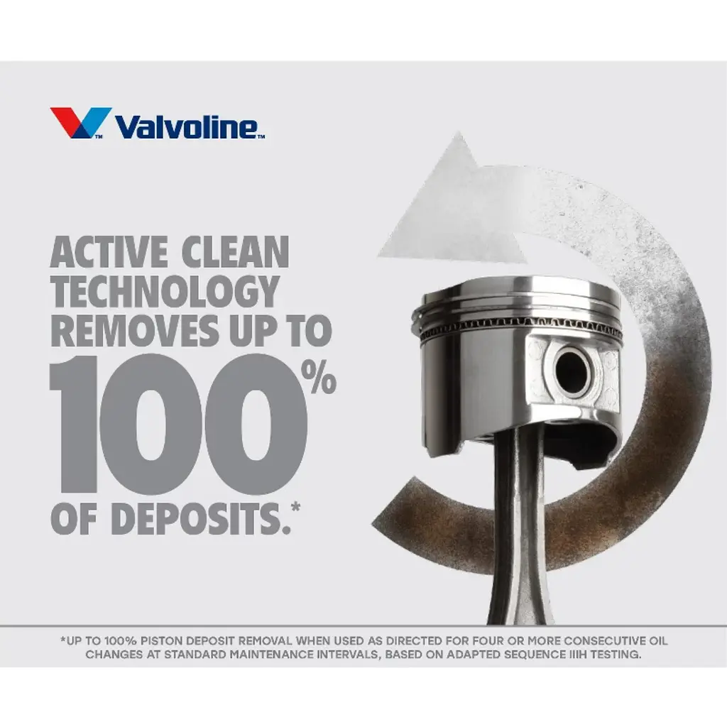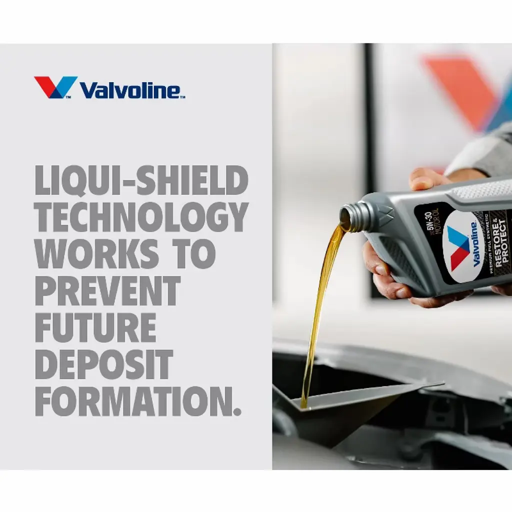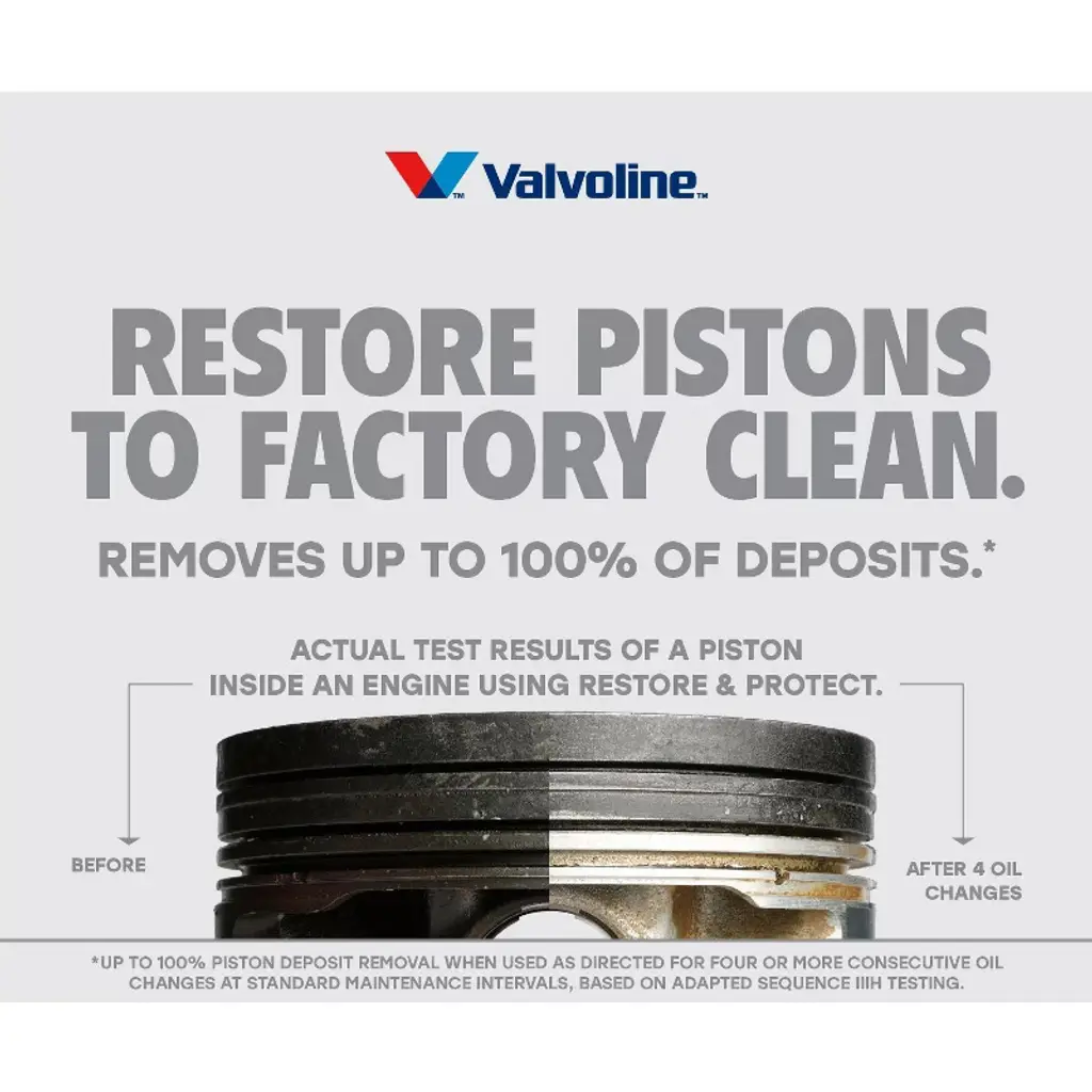 Restore & Protect Premium Full Synthetic is the biggest breakthrough in motor oil since Valvoline introduced it 150 years ago. With continuous use, Valvoline’s proprietary Active Clean technology removes up to 100% of deposits, while its exclusive Liqui-Shield technology works to prevent future deposit formation. A clean engine minimizes friction between metal surfaces, helping to improve fuel economy. Valvoline Restore & Protect is the best motor oil for any age vehicle, from a new car’s first oil change to high-mileage vehicles. There’s no other motor oil like it. Valvoline Restore and Protect Premium Full Synthetic helps maximize fuel economy, horsepower, and engine life. We made it first, so you can keep your pistons factory clean. Renew. Restore. Repeat. (*with regular oil changes. In Adapted Sequence IIIH Testing: Piston Deposit Removal) The best motor oil for any age vehicle, from your new car’s first oil change to high-mileage vehicles.