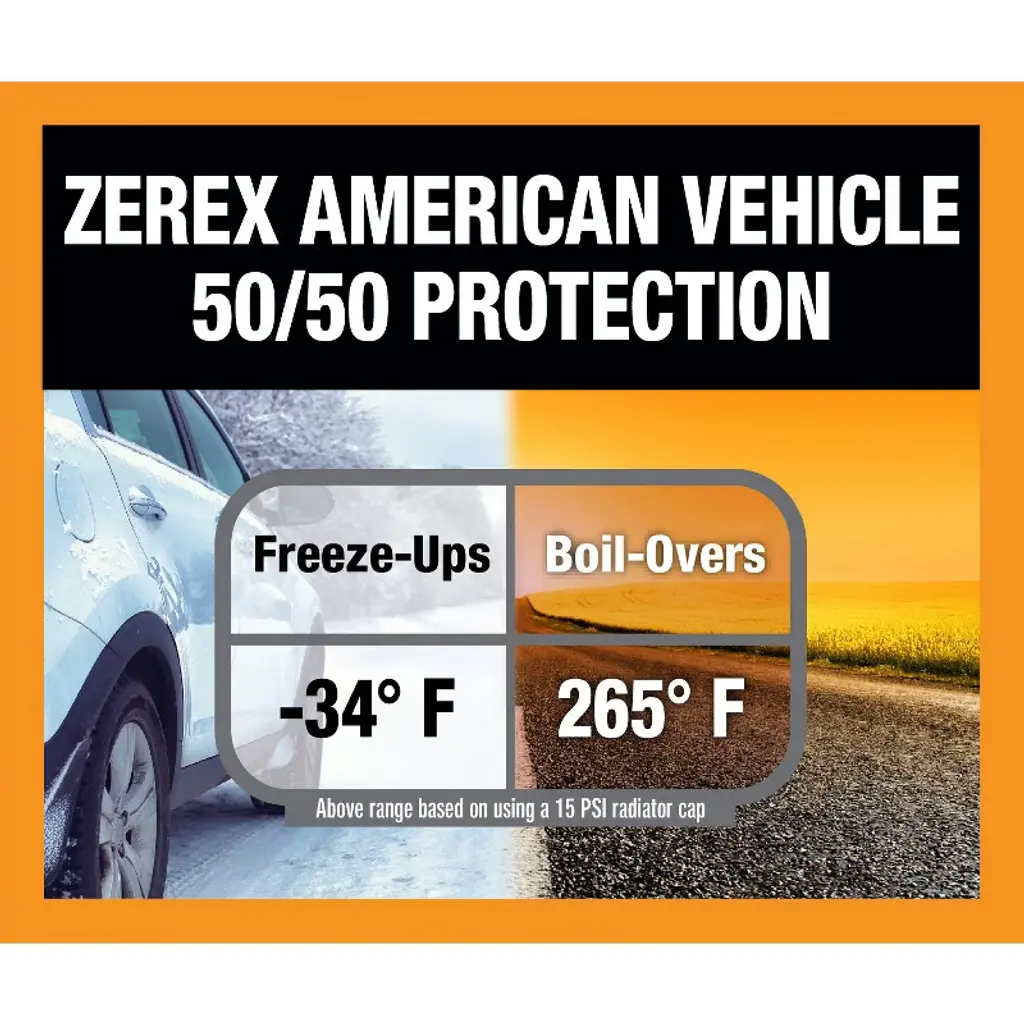 Zerex from Valvoline is the #1 selling OEM-approved coolant brand. Zerex American Vehicle Antifreeze/Coolant is proven to maximize engine life in American vehicles such as Ford, Chrysler and General Motors that specify an orange extended life formula with Organic Acid Technology (OAT). Specially formulated without silicates and phosphates, Zerex is made for your car and protects better than industry standards against corrosion, leaking, deposits as well as freezing and boiling – the four main causes of cooling system failure, which is the leading cause of engine breakdown. Our state-of-the-art OAT formula is silicate and phosphate-free. It protects from corrosion, scale and rust, so radiators, water pumps and other metal cooling system parts (including aluminum) stay clean and your antifreeze flows and functions properly. Zerex American Vehicle Antifreeze/Coolant does not contain amines, borates, nitrates or nitrites. So whether you’re topping off your radiator or doing a complete system flush, trust Zerex American Vehicle Antifreeze/Coolant. Made for your car. Made by Valvoline.