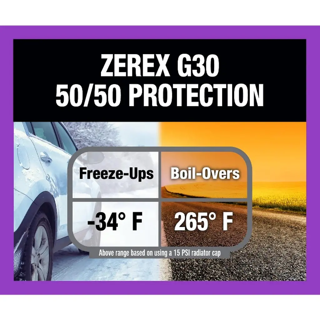 Zerex from Valvoline is the #1 selling OEM-approved coolant brand. Zerex G30 Antifreeze/Coolant is proven to maximize engine life in Chrysler, European Ford, Fiat, GM, Jaguar, Jeep, Land Rover and VW vehicles. Its premium carboxylate formulation is specially formulated with state-of-the-art Organic Acid Technology (OAT). Zerex is made for your car and protects better than industry standards against corrosion, leaking, deposits as well as freezing and boiling – the four main causes of cooling system failure, which is the leading cause of engine breakdown. Our OAT formula is silicate and phosphate-free in an ethylene glycol base. It protects from corrosion, scale and rust, so radiators, water pumps and other metal cooling system parts(including aluminum) stay clean and your antifreeze flows and functions properly. Zerex G30 Antifreeze/Coolant does not contain amines, borates, nitrates or nitrites. So whether you’re topping off your radiator or doing a complete system flush, trust Zerex G30 Antifreeze/Coolant. Made for your car. Made by Valvoline.