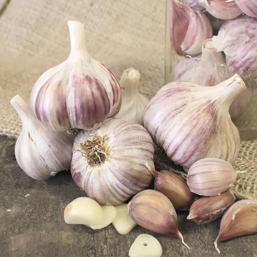 Garlic, like shallots and onions, is a member of the allium family and is a species within the allium genus. Garlic is one of the most popular vegetables used to season in cooking. Studies have shown there are many benefits to adding garlic to your dishes. It is said to lower blood pressure, reduce inflammation, help lower cholesterol, support immune function and may reduce blood clotting. Garlic is easy to grow and is a great addition to your edible garden. Silver skin garlic, also known as 'softneck garlic', is a type of garlic known for its papery white outer skin that resembles silver or white parchment paper. It is one of the most widely cultivated varieties. Silver skin garlic typically produces bulbs with many cloves in varying sizes within the same bulb. Its flavor is more mild than other garlic varieties, being slightly sweet and less spicy than hardneck varieties. Silver skin garlic is easy to peel. It has a long shelf life and stores well. It is adaptable to many gardens and climates throughout the world, making it a staple choice for commercial growers. The garlic bulbs we ship are usually on average between 1-1.5" in diameter, which by industry standards weigh approximately 12-16 bulbs per pound.