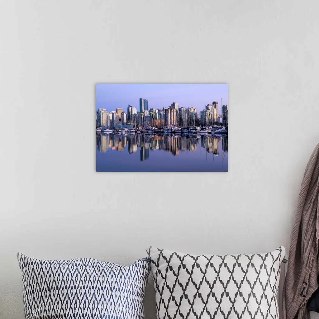 Photograph of a purple sunset over the Vancouver skyline and harbor reflecting onto the False Creek River, British Columbia, Canada.