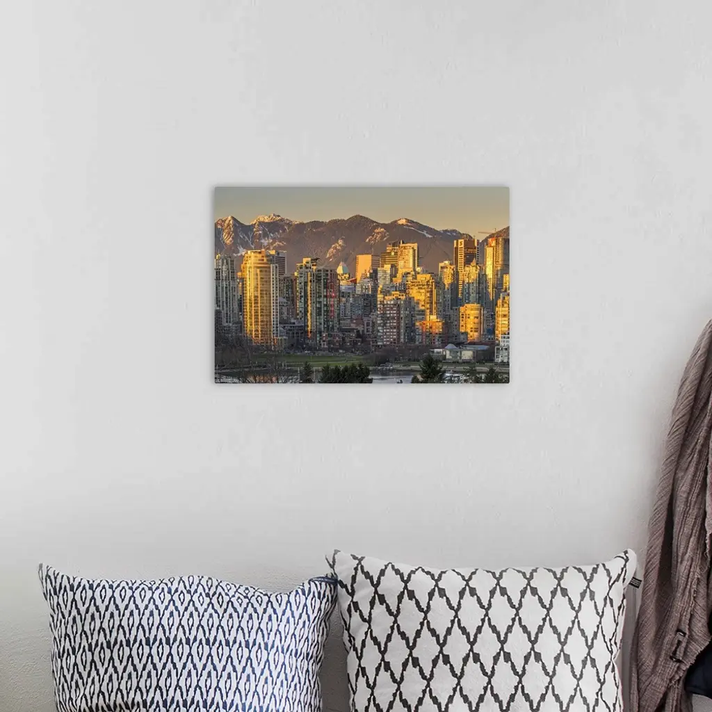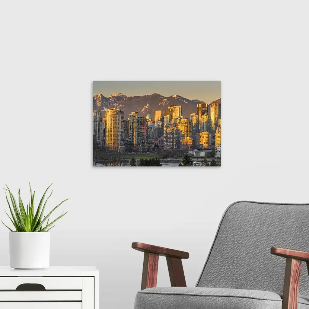 Downtown skyline with snowy mountains behind at sunset, Vancouver, British Columbia, Canada.