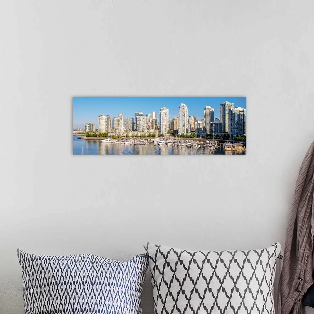 Panoramic photograph of part of the Vancouver, British Columbia skyline with False Creek Harbor and boats in the foreground.