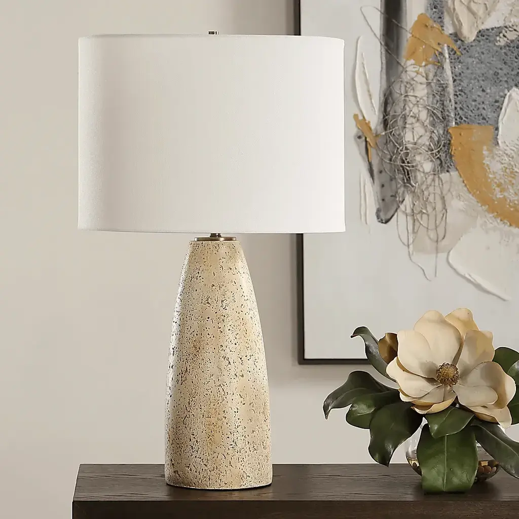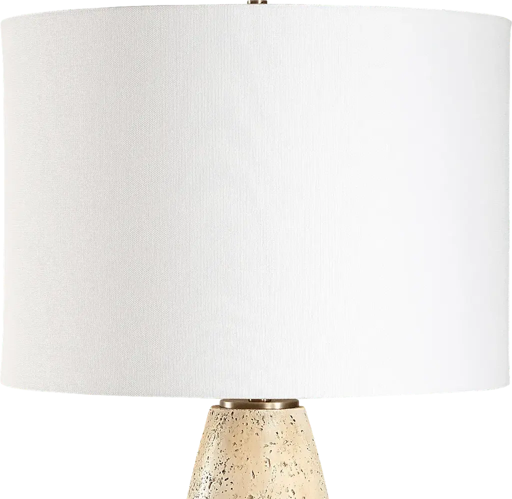 The Vanderbilt Bay Beige Lamp blends natural charm with timeless sophistication. The crafted base exudes an earthy essence that features an unfilled travertine look while plated antique brass detailing adds a refined touch. The round hardback drum shade is finished in a crisp white linen fabric. Partial assembly may be required.
