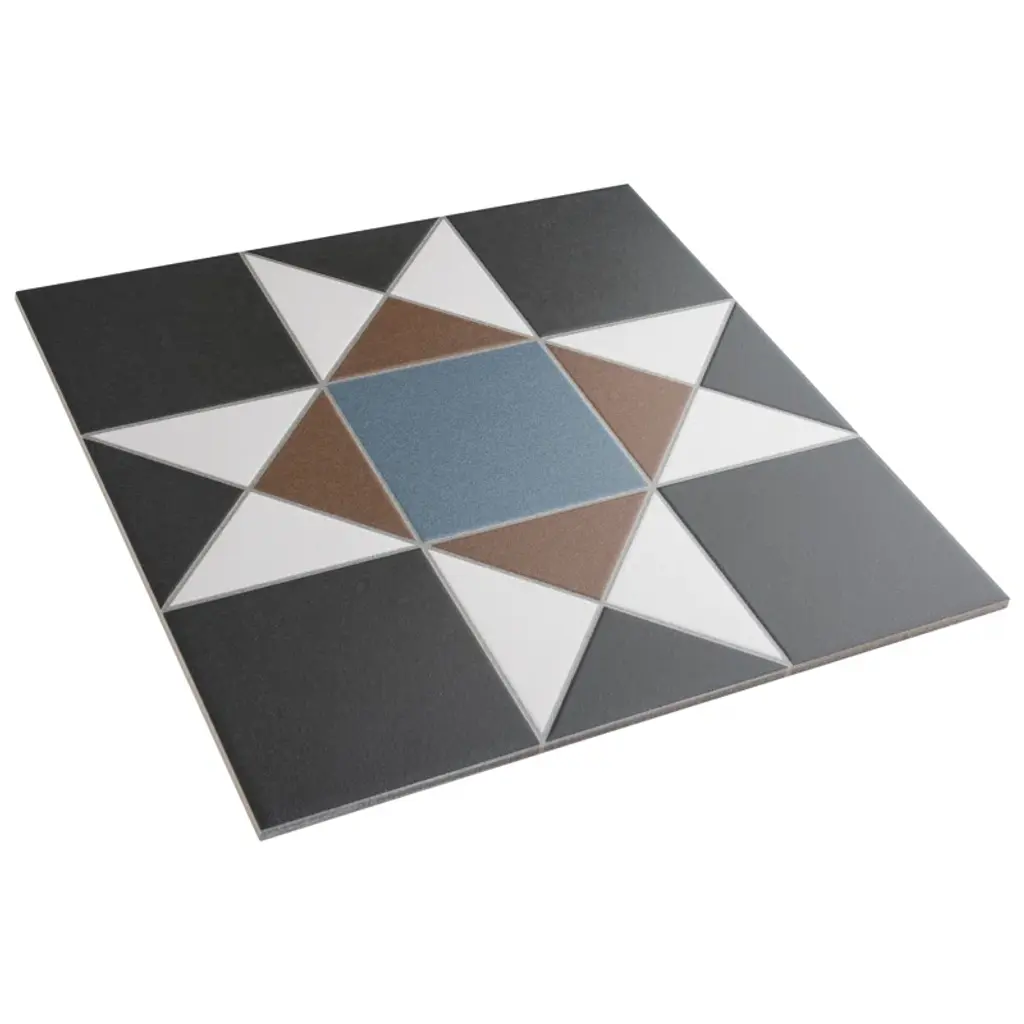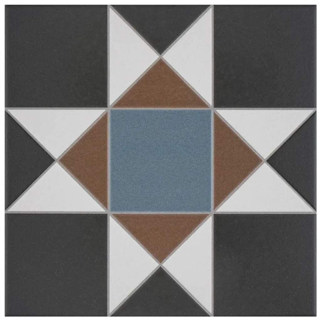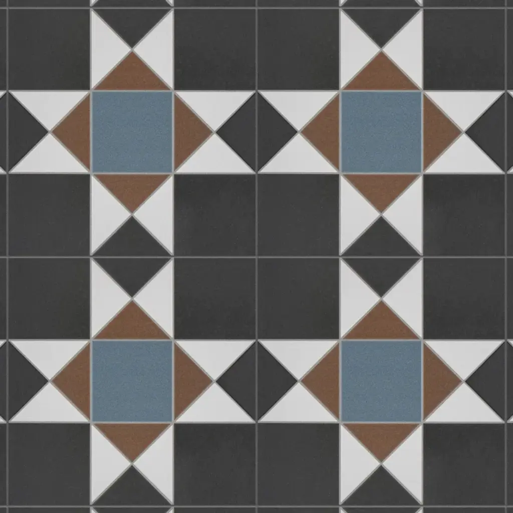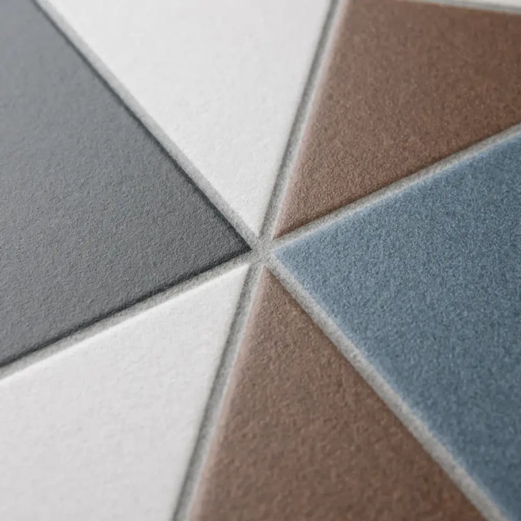 This tile features geometric shapes and is reminiscent of mosaic looks. The combination of triangles and squares is accented by textured finishes, dramatic glaze, and rustic colors.
