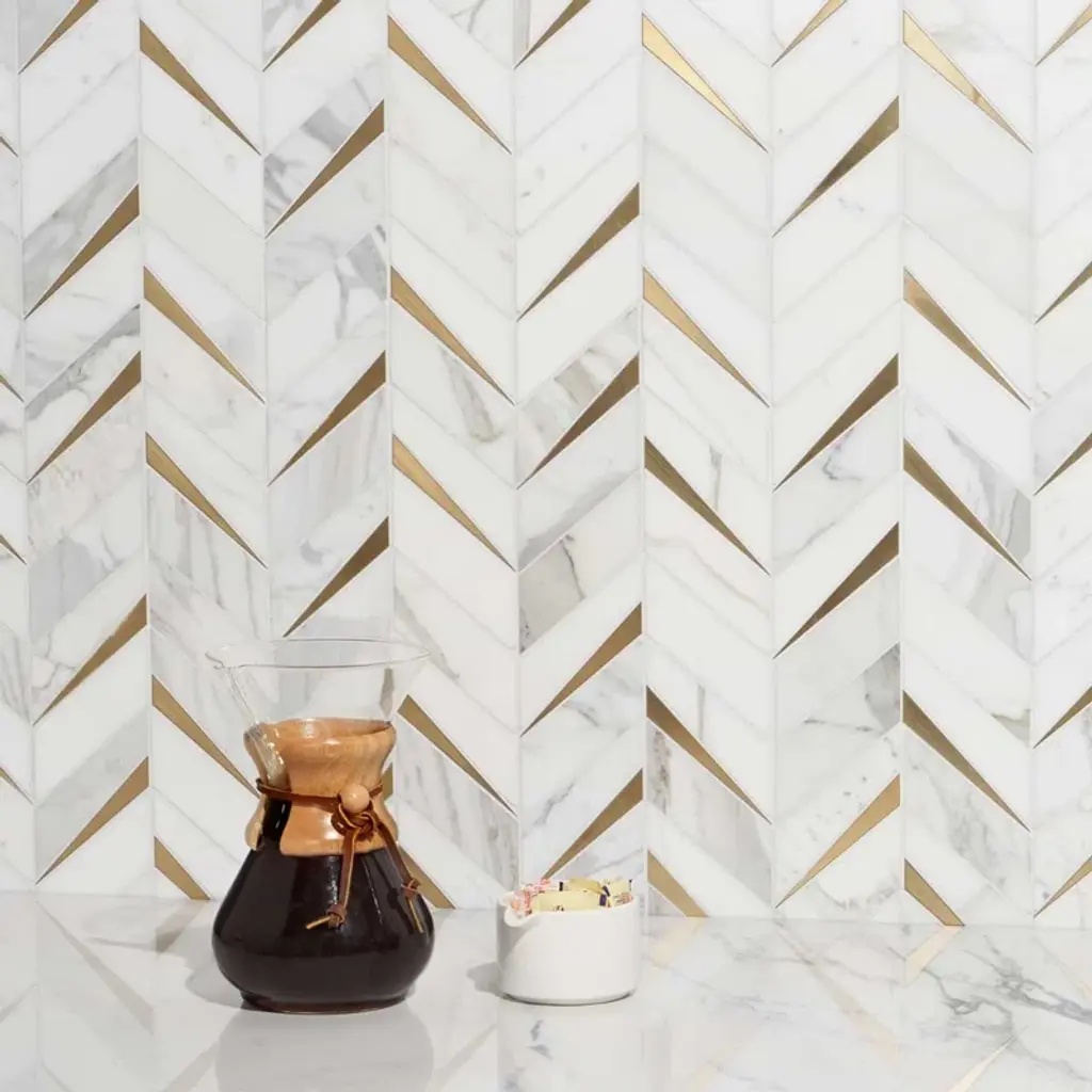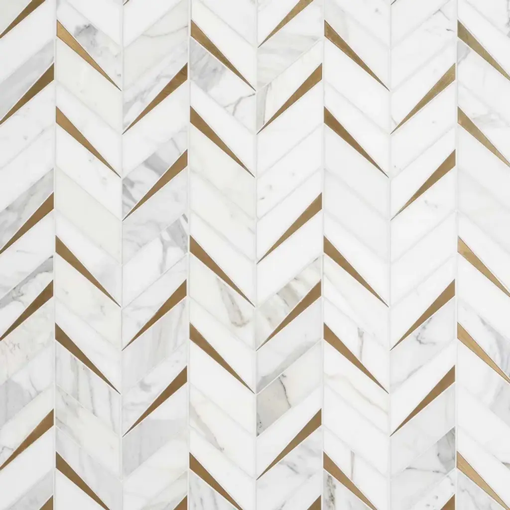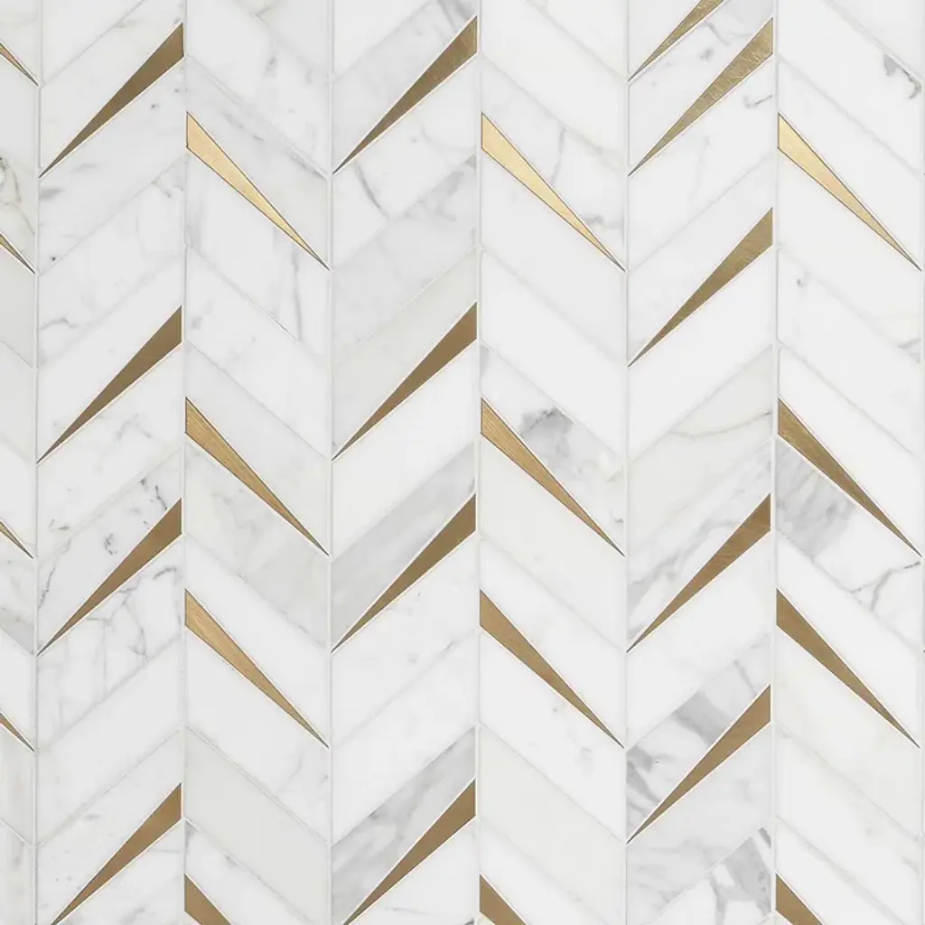 The Vara Calacatta polished marble and brass mosaic tiles feature elegant white and gray Calacatta marble in a classic chevron pattern, with porcelain-backed brass inlays that add a contemporary appeal to the glamorous design. A polished finish on the marble enhances the reflective shine, creating an eye-catching and bold visual. Exude glamour and style with the Art-Deco-inspired luxury of our Vara collection. This opulent interpretation of the classic chevron pattern incorporates a high-grade marble with alternating brass inlays, creating a dramatic and elegant look. The polished finish of the marble enhances the reflective quality of the design, and an even surface promotes easy installation. These mosaics make a luxurious impact as a bold backsplash, feature wall, or decorative accent.