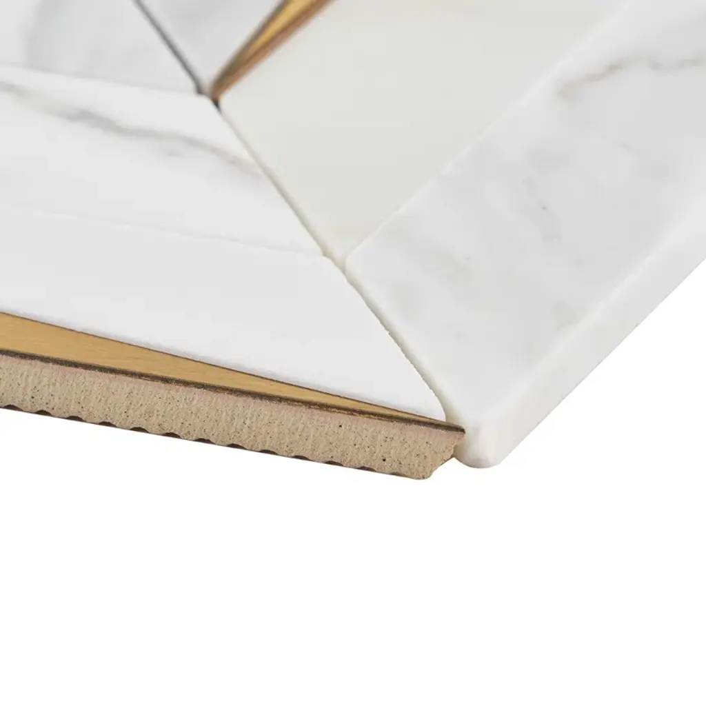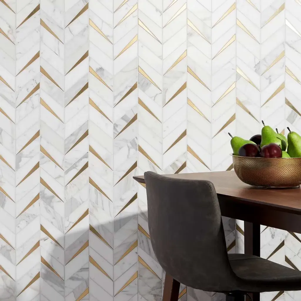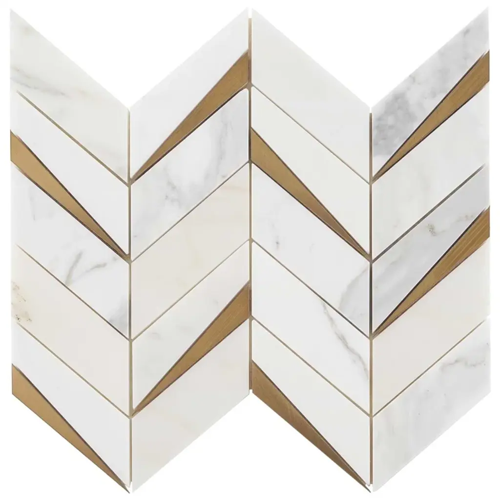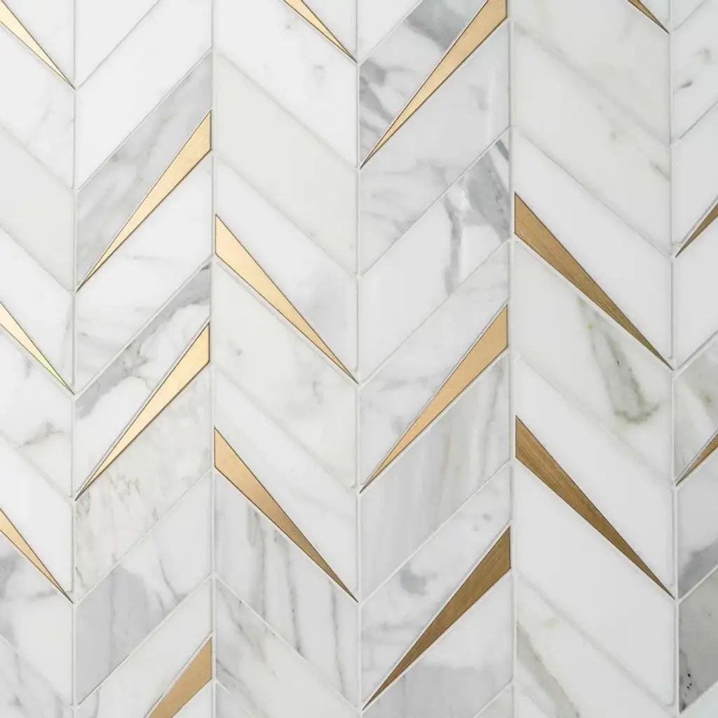 The Vara Calacatta polished marble and brass mosaic tiles feature elegant white and gray Calacatta marble in a classic chevron pattern, with porcelain-backed brass inlays that add a contemporary appeal to the glamorous design. A polished finish on the marble enhances the reflective shine, creating an eye-catching and bold visual. Exude glamour and style with the Art-Deco-inspired luxury of our Vara collection. This opulent interpretation of the classic chevron pattern incorporates a high-grade marble with alternating brass inlays, creating a dramatic and elegant look. The polished finish of the marble enhances the reflective quality of the design, and an even surface promotes easy installation. These mosaics make a luxurious impact as a bold backsplash, feature wall, or decorative accent.