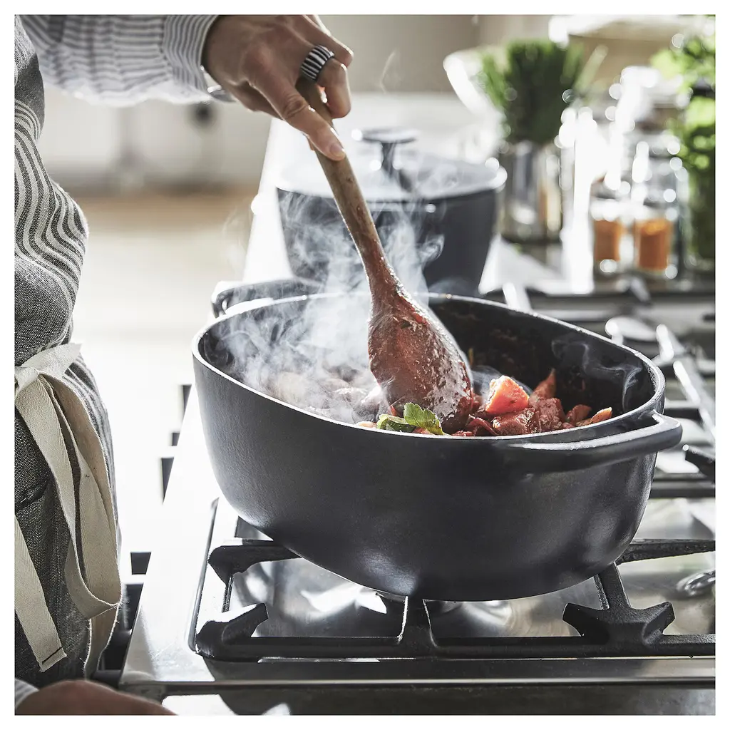 VARDAGEN Pot with lid - enamelled cast iron matte/black 6.9 qt. Made from enameled cast iron, which spreads heat evenly through the pan and retains the heat for a long time. This makes it ideal, for example, for slower cooking such as roasts and casseroles.