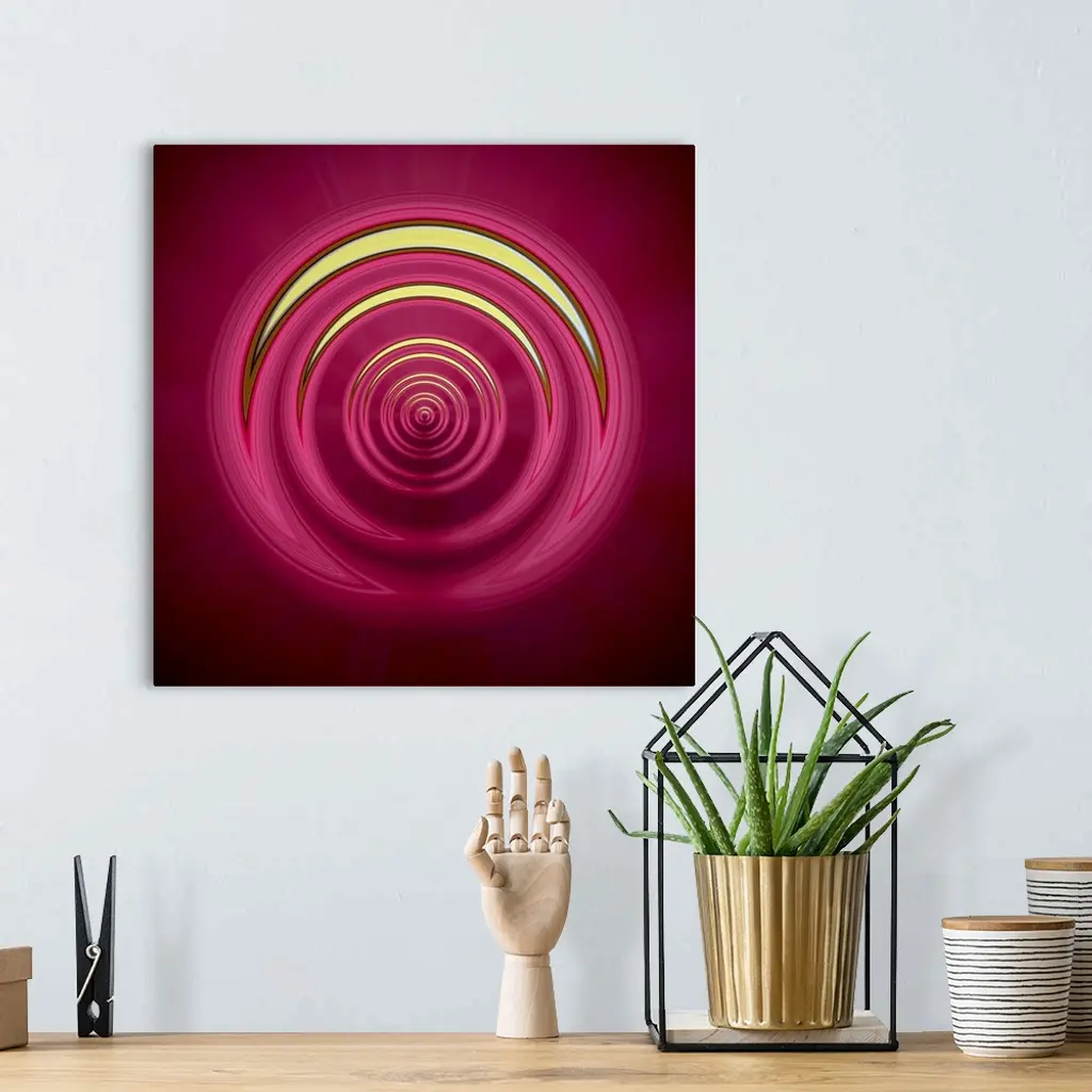 Pink circles with yellow arched tops inside each other on a square background with a slightly dark vignette.