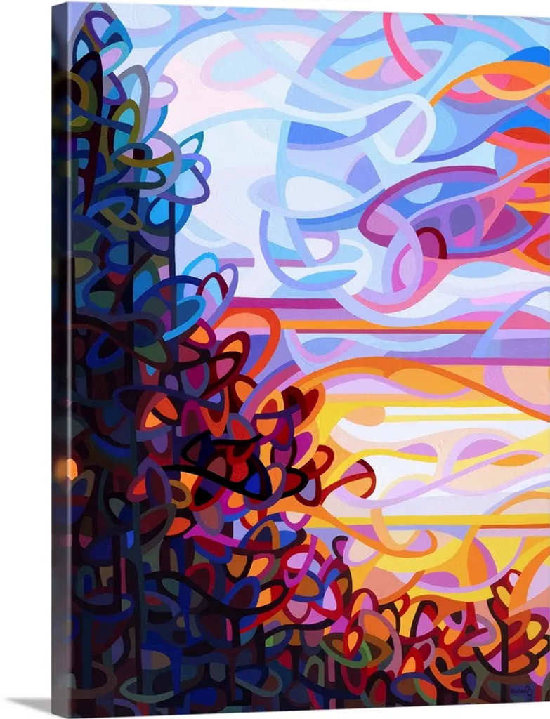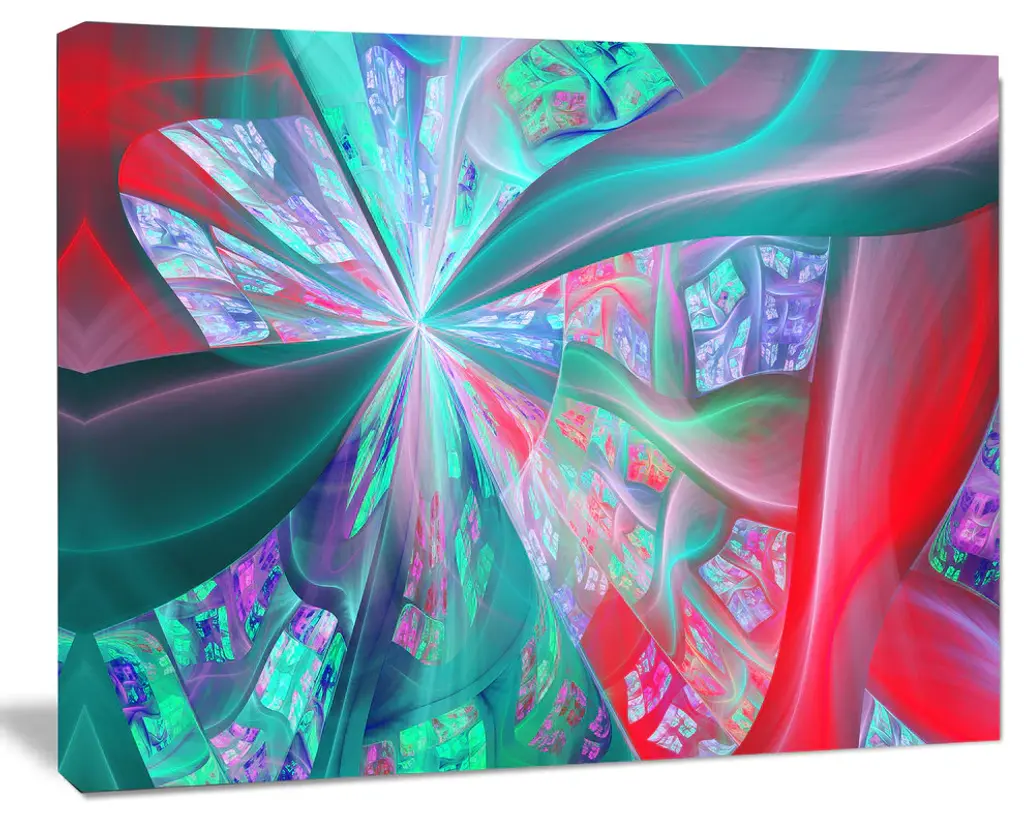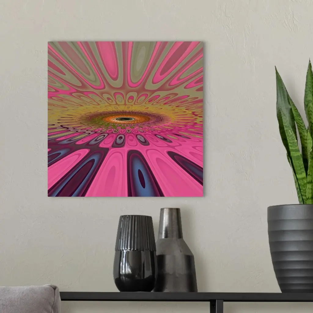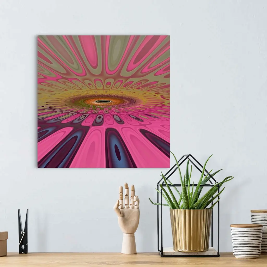 Circular shapes combined together in bright shades of pink and dark shades of blue leading to a circular center with bright orange creating depth in the image.